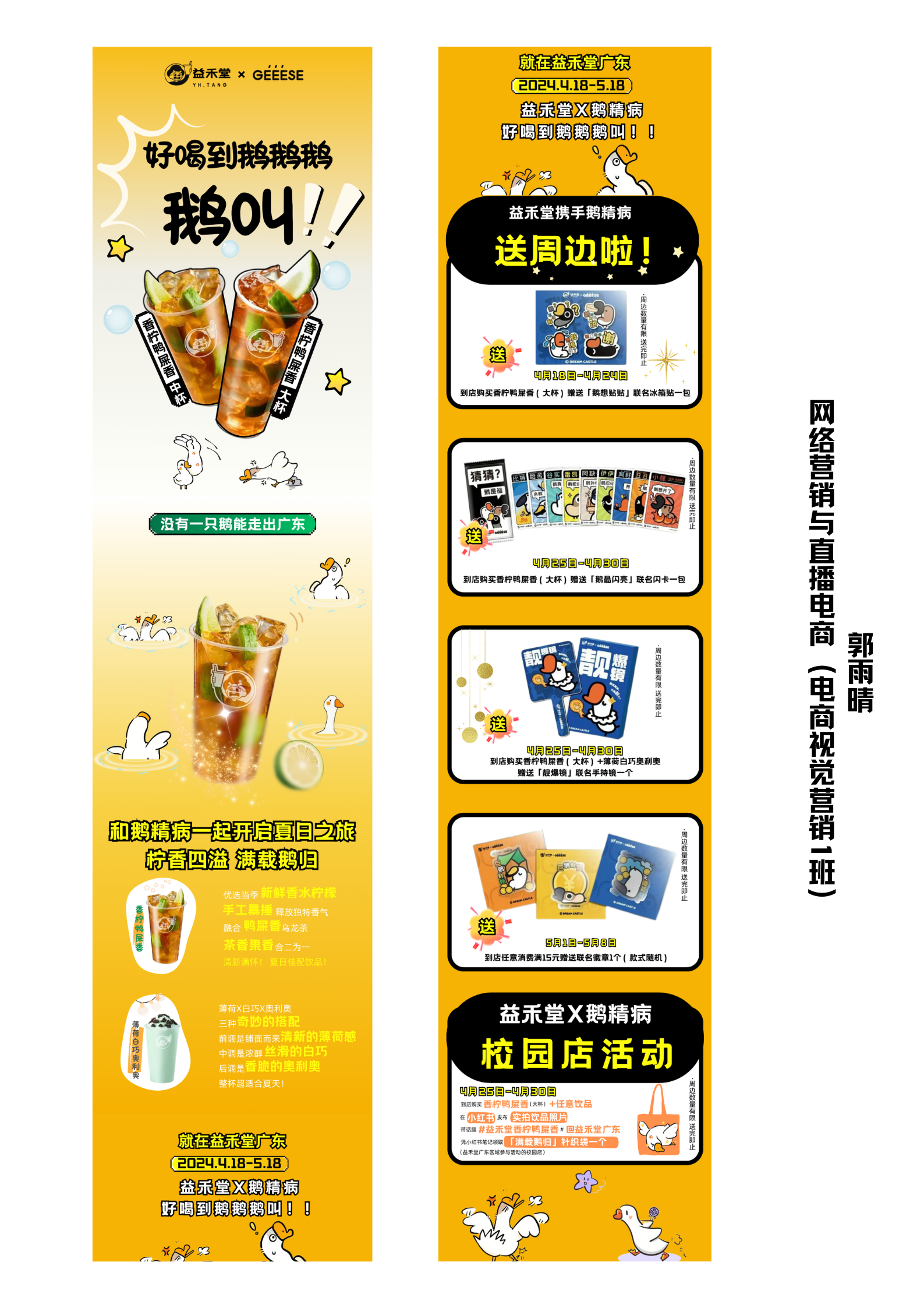 在《直播电商脚本策划》的课程实践中,2023届网络营销与直播电商专业的学生们,以各大电商品牌产品为蓝本,展开了一场营销文案与活动策划的可视化训练。经过一年电商直播理论与实践的学习,学生们已具备一定的品牌认知和产品卖点提炼能力。 本次展出的系列品牌产品海报与长图,是从学生课堂作业中筛选的较为优秀的作品,作品涵盖了库迪、瑞幸等饮品品牌,小米等科技产品,以及微信读书、京东金融APP等应用,风格多样,创意十足。学生们在缺乏Photoshop等专业软件基础的情况下,利用Canva、创客贴等基础在线设计工具,通过模仿与创新,将课程中学到的品牌认知、卖点提炼、活动策划、场景塑造等理论知识灵活应用于海报创作中,这些海报不仅锻炼了学生们的产品信息提炼能力,还考验了他们的文图排版、色彩搭配与元素选择技巧。 本次系列优秀作品展出,不仅是对学生们本学期学习成果的一次检阅,更是对他们创意与实践能力的展示。每幅作品都凝聚着学生们的心血与创意,展现出了他们在品牌产品信息提炼、文图排版等方面的潜能。希望这次展出能够激励更多同学积极参与课程实践,相互学习,共同进步,为未来的直播电商领域注入更多新鲜血液与创新活力。 审核:石冰清 编辑:杨安易 排版:慕若华