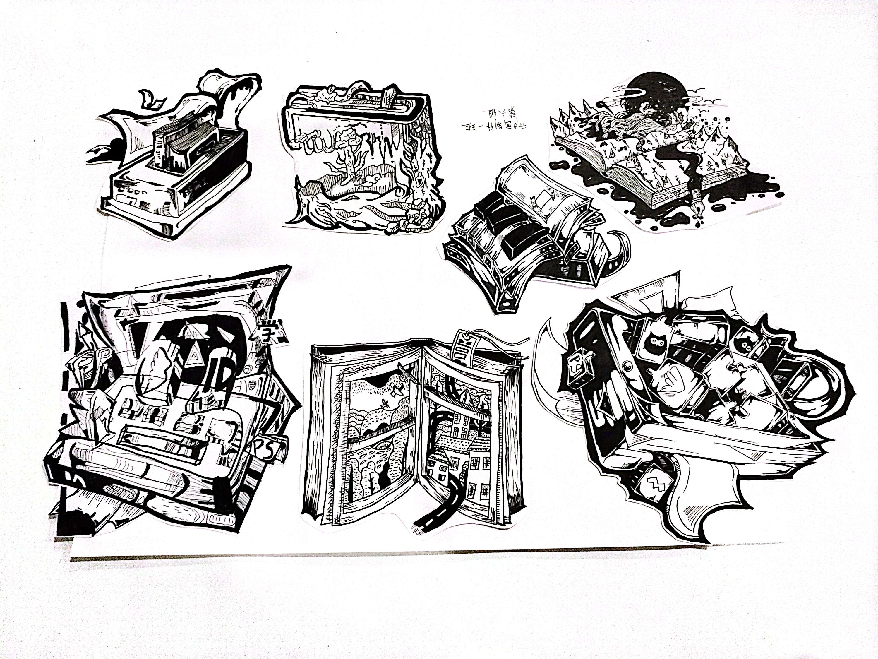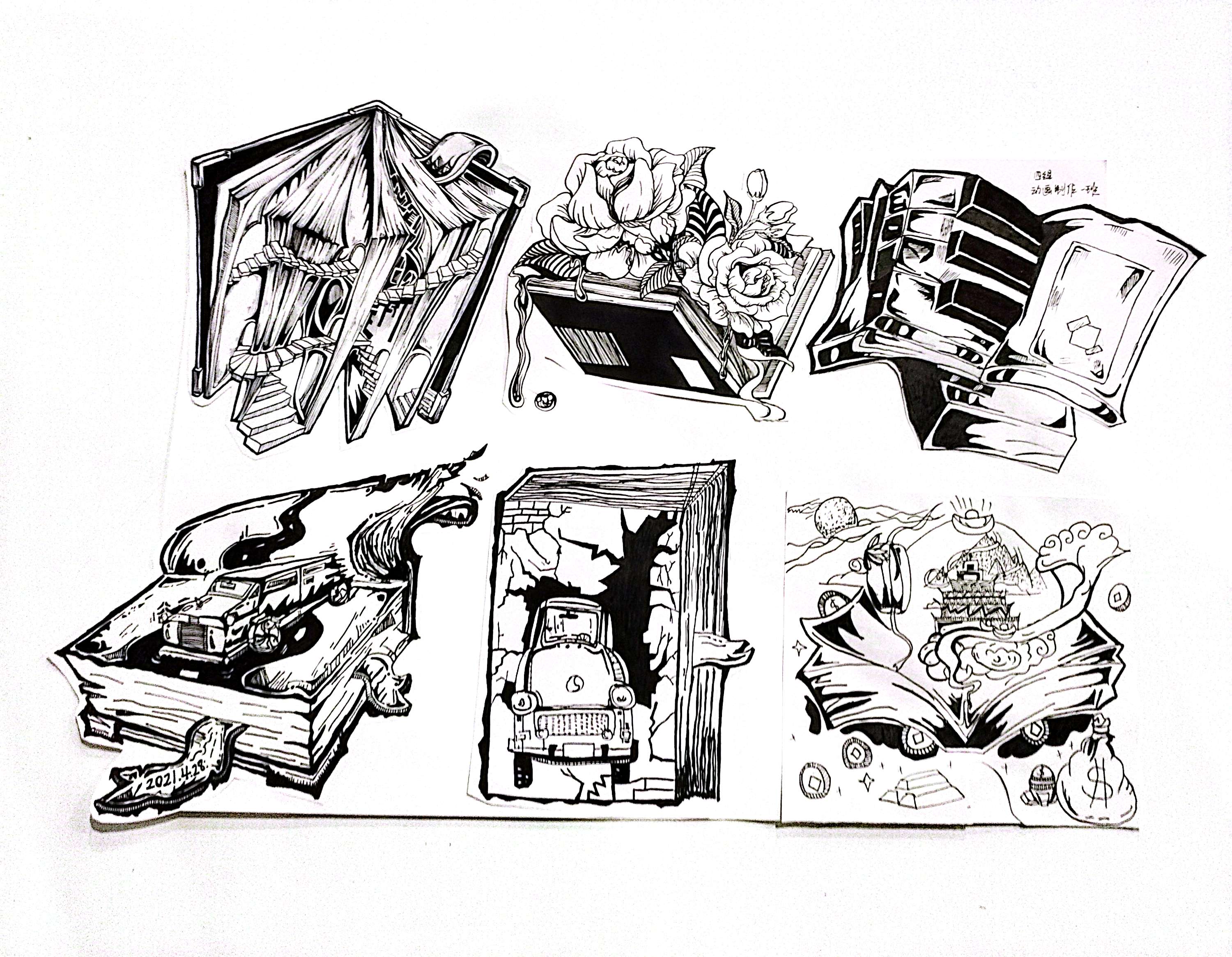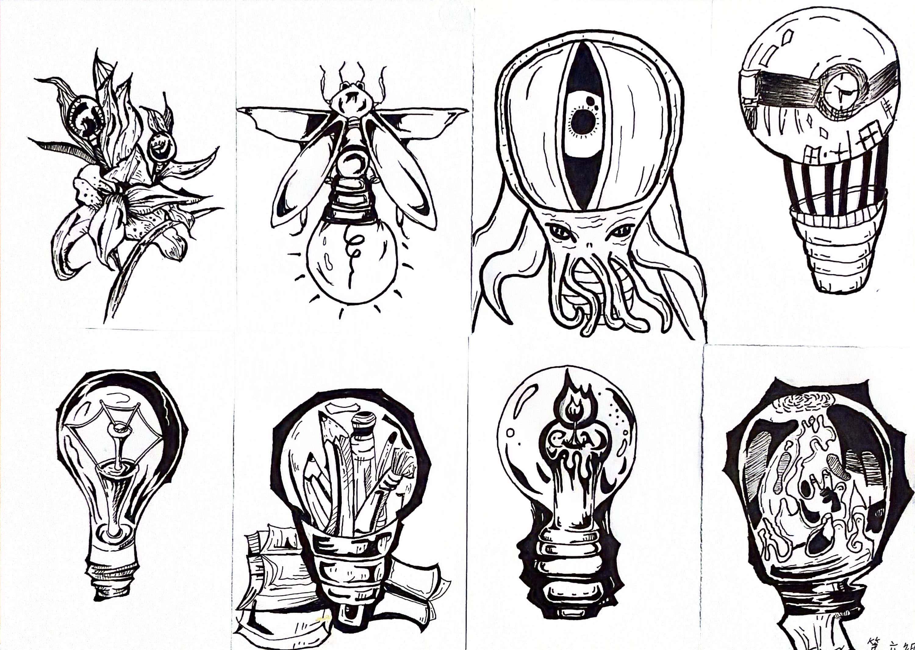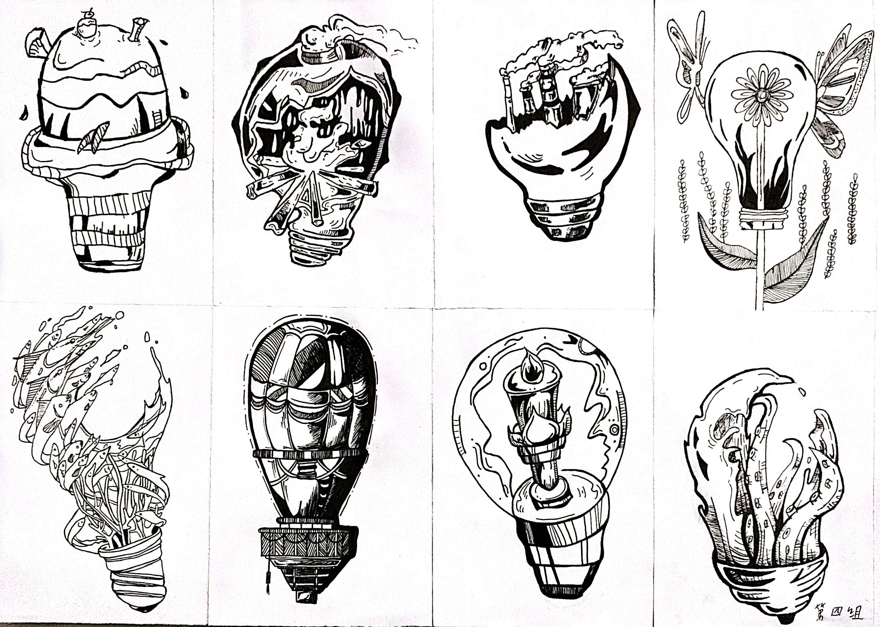同构创意图形是指将两个或两个以上不同物体的材质进行替换、嫁接、拼凑,从而创造出形象统一,含义丰富的图形。学生将“灯泡”、“书”、“植物”、“留声机”用同构的表现手法,以小组为单位,每人画一个造型,创作一幅作品,以下是每个班级优秀作业展示: