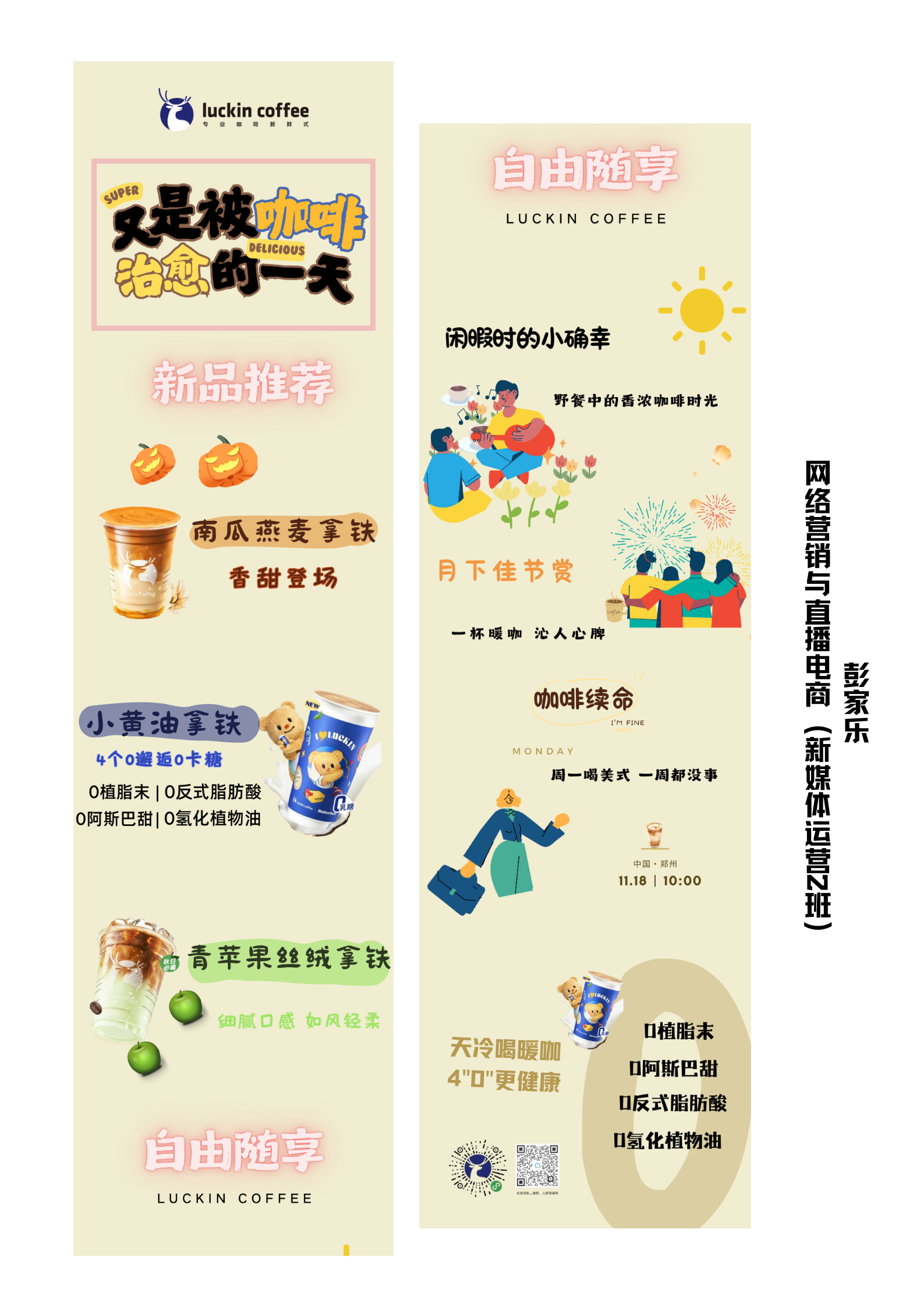 本次展出的系列品牌产品海报与长图,是从学生课堂作业中筛选的较为优秀的作品,作品涵盖了库迪、瑞幸等饮品品牌,小米等科技产品,以及微信读书、京东金融APP等应用,风格多样,创意十足。学生们在缺乏Photoshop等专业软件基础的情况下,利用Canva、创客贴等基础在线设计工具,通过模仿与创新,将课程中学到的品牌认知、卖点提炼、活动策划、场景塑造等理论知识灵活应用于海报创作中,这些海报不仅锻炼了学生们的产品信息提炼能力,还考验了他们的文图排版、色彩搭配与元素选择技巧。