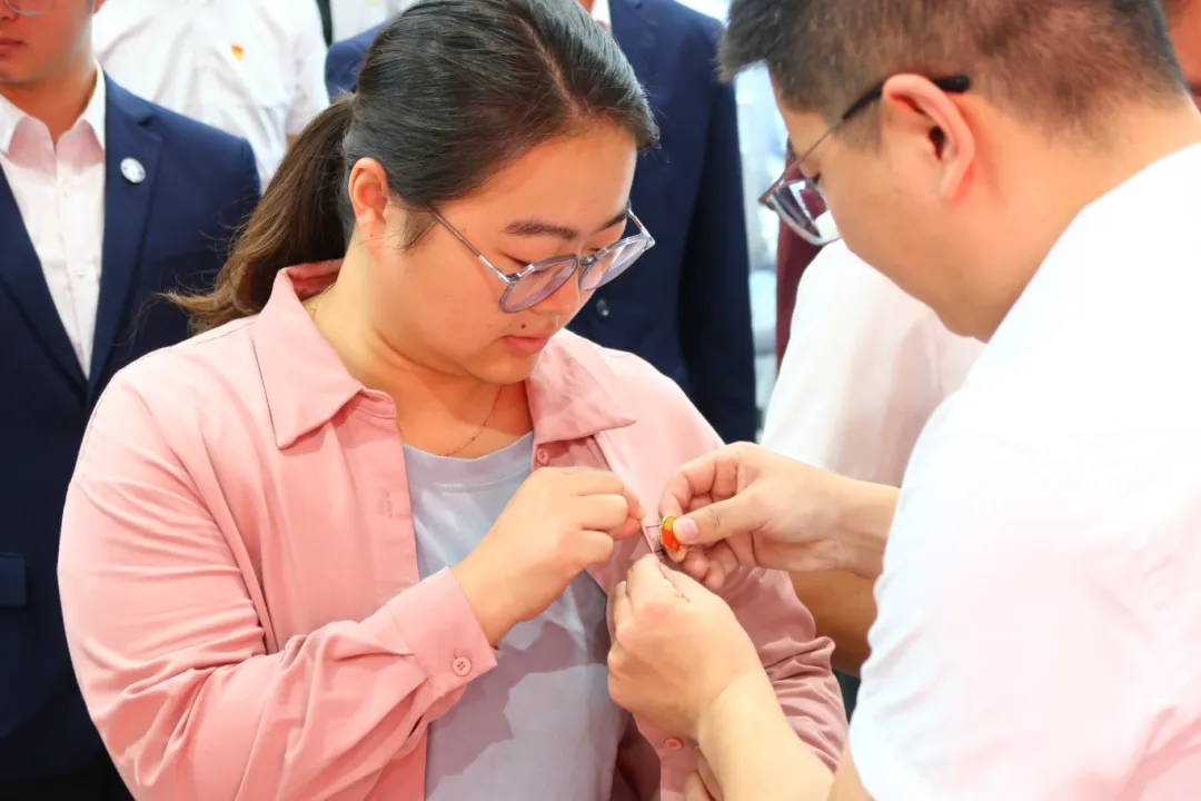 各党支部书记、副书记为新党员佩戴党徽,勉励新党员永葆入党初心。一枚枚闪耀的党徽象征着红色基因的传承,也标志着新生命新征程的开启。