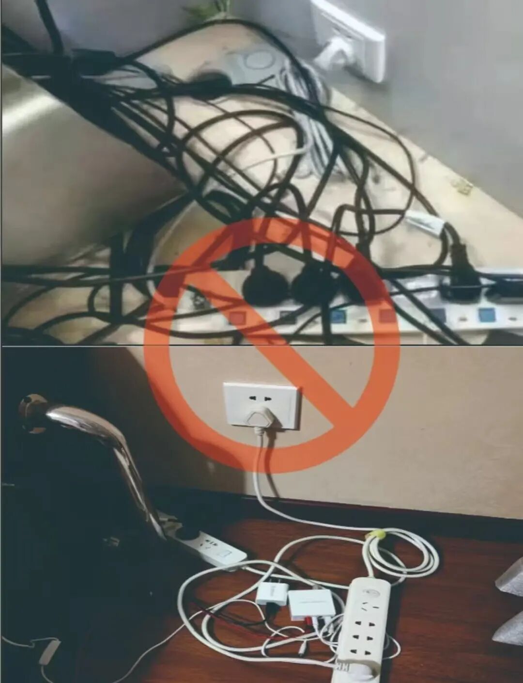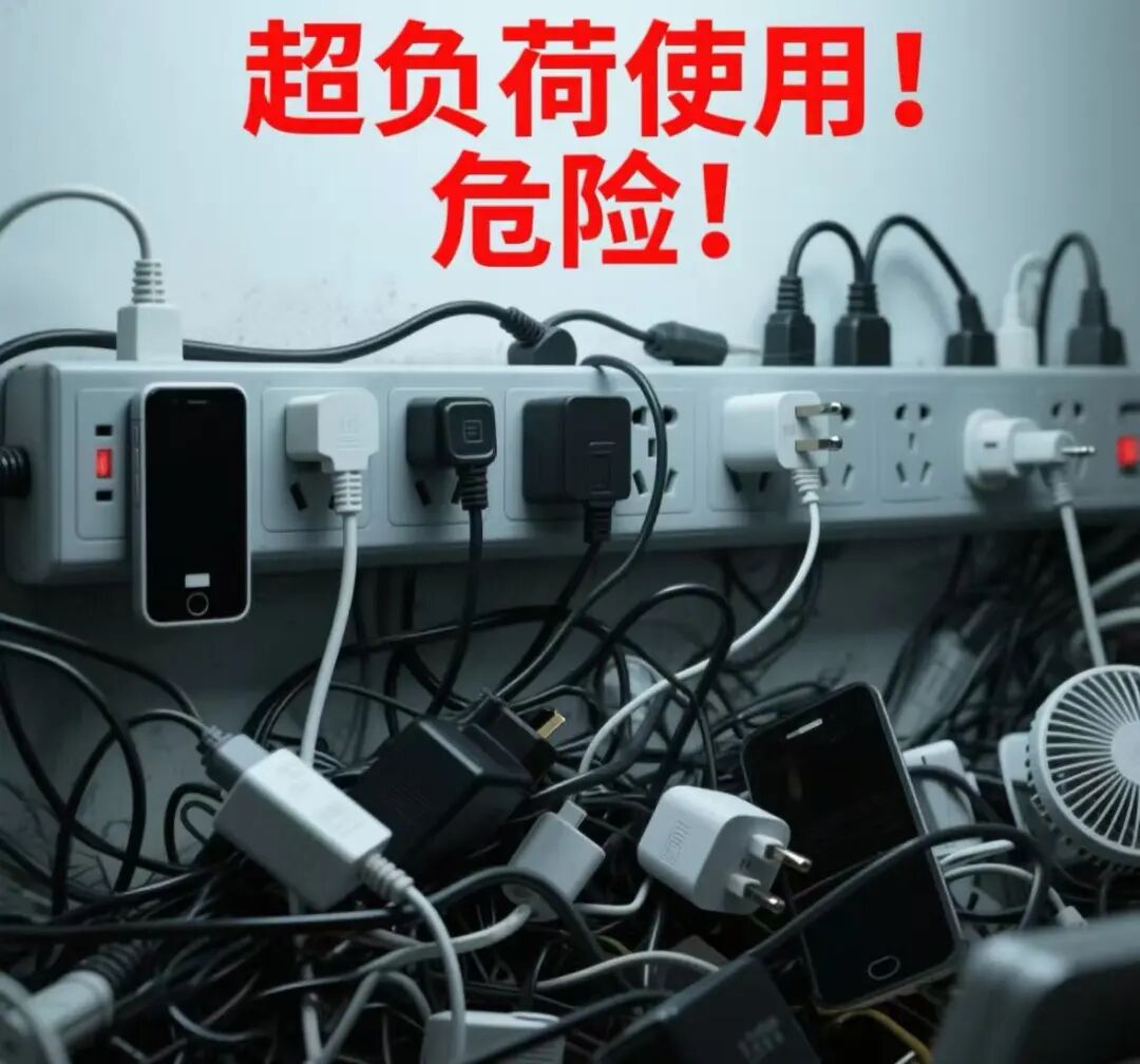 3.严禁超负荷用电:一个插座不插过多电器,尤其避免“一个插线板连多个插线板”的“串接”行为,防止电流过大烧毁线路。