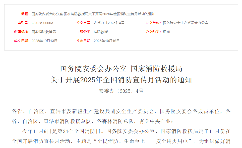 近日,国务院安委会办公室、国家消防救援局联合印发通知,定于今年11月在全国范围内开展以“全民消防、生命至上——安全用火用电”为主题的第34个全国消防宣传月活动。今年的活动将聚焦提升全民消防安全意识和自防自救能力,特别是针对日常生活中普遍存在的用火用电安全问题,部署开展一系列内容丰富、形式多样的宣传教育活动。
