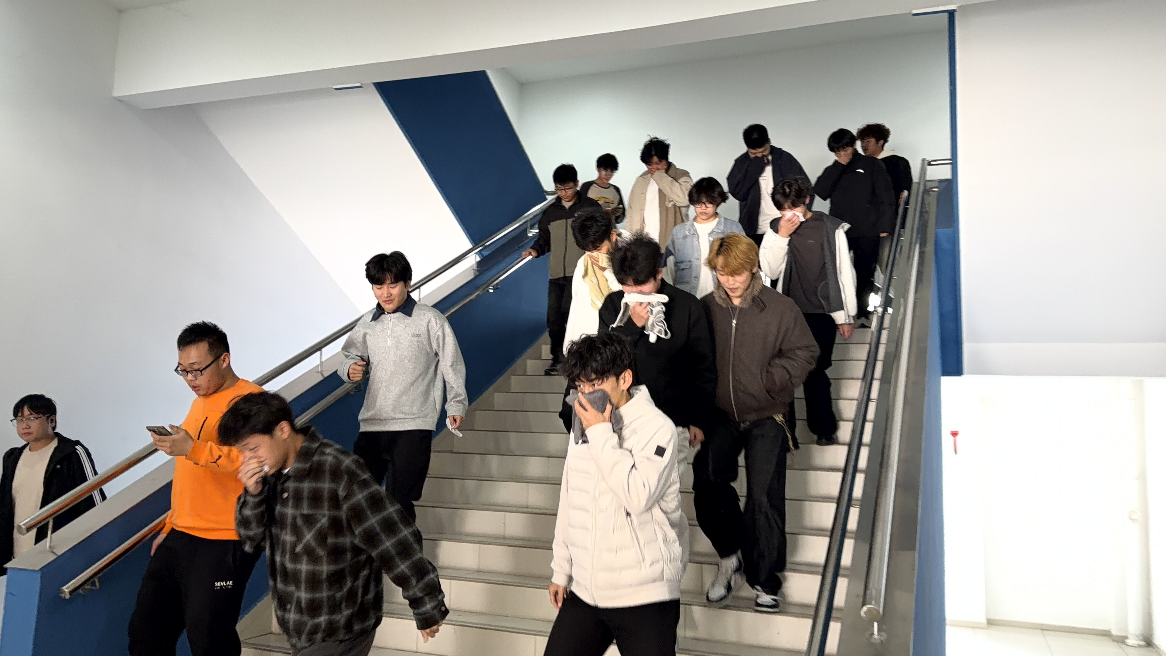 中午时分,消防警报、消防应急广播响起。各楼层学生在现场工作人员指引下,弯腰低姿捂口鼻,沿预定路线快速、有序撤离至指定安全区域。整个过程组织严密、响应迅速,达到了预期效果。