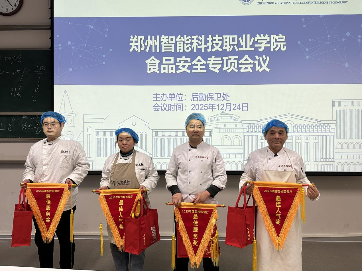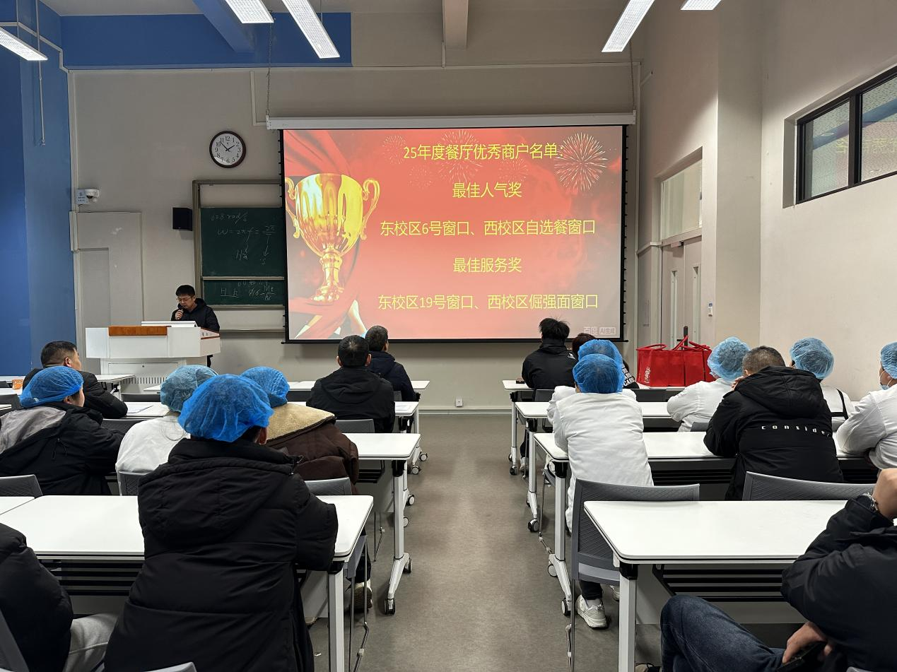 会议首先举行了2025年度东、西校区餐厅“最佳人气奖”“最佳服务奖”优秀商户颁奖仪式,赵处长为获奖商户颁发锦旗及奖品,并对全体餐饮服务人员一年来的辛勤付出表示感谢。他指出,正是大家的日复一日的坚守与努力,才保障了全校数千名师生全年的餐饮需求,此次表彰既是对优秀商户用心经营的肯定,也是对餐饮行业敬业精神的认可。