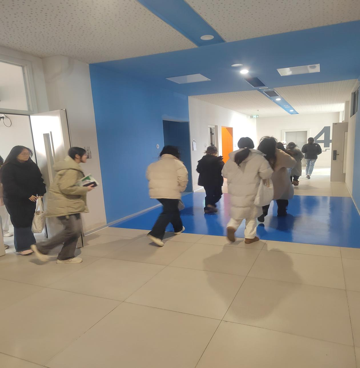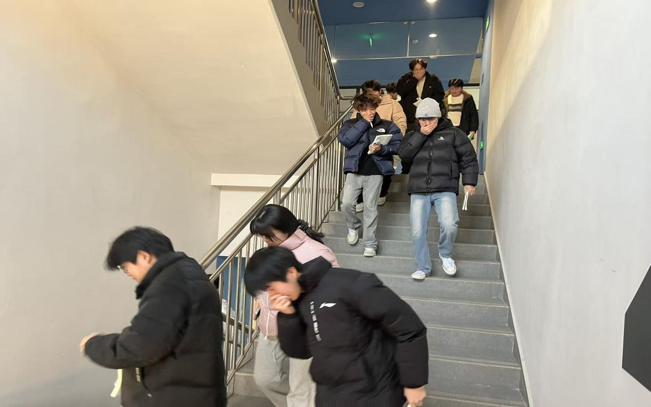 中午时分,消防警报与应急广播同步响起。在教学楼四楼上课的学生在工作人员指引下,迅速反应,弯腰低姿、捂住口鼻,沿预定疏散路线快速、有序撤离至指定安全区域。整个演练过程组织严密、响应迅速、衔接顺畅,达到了预期效果。