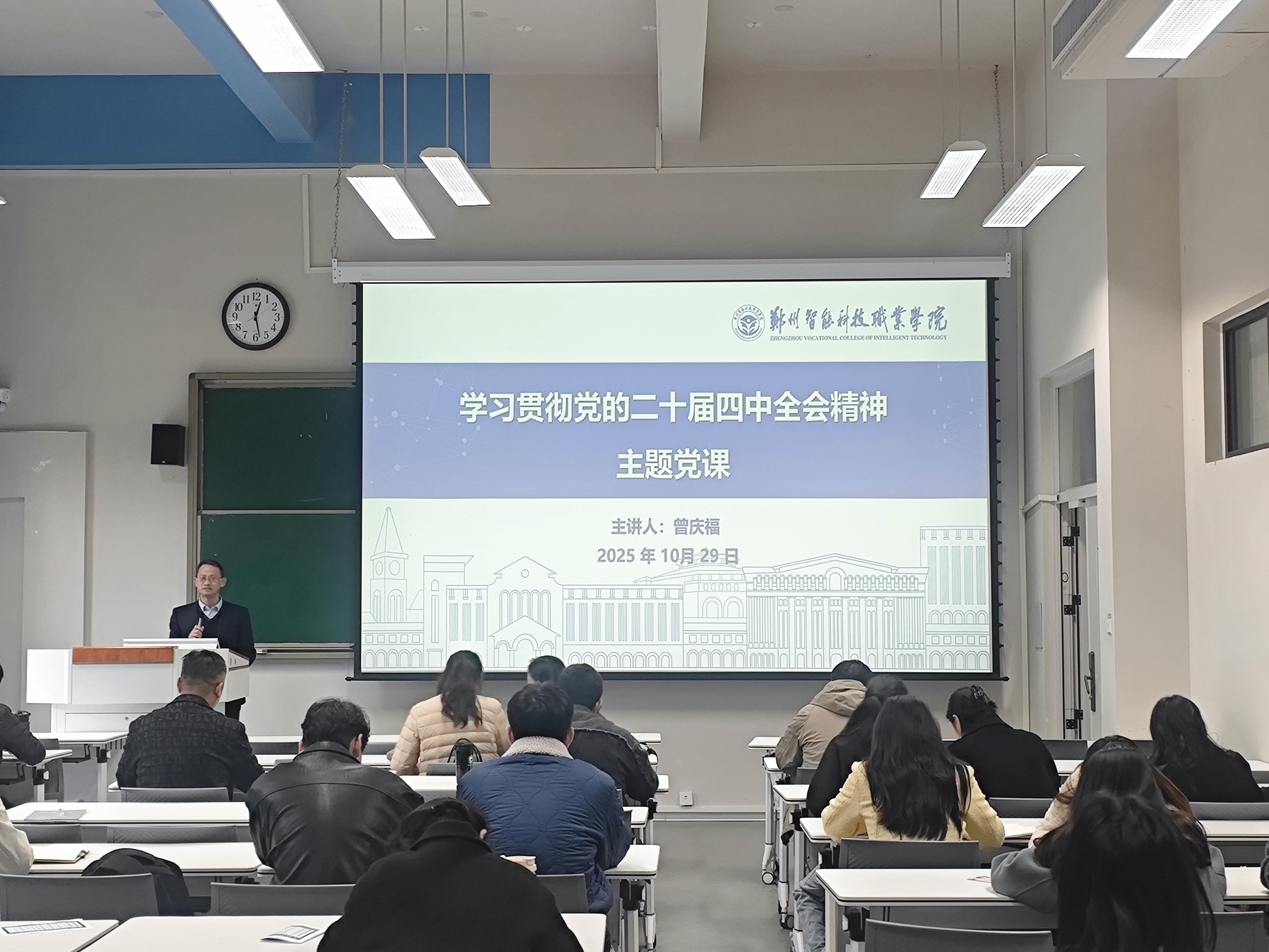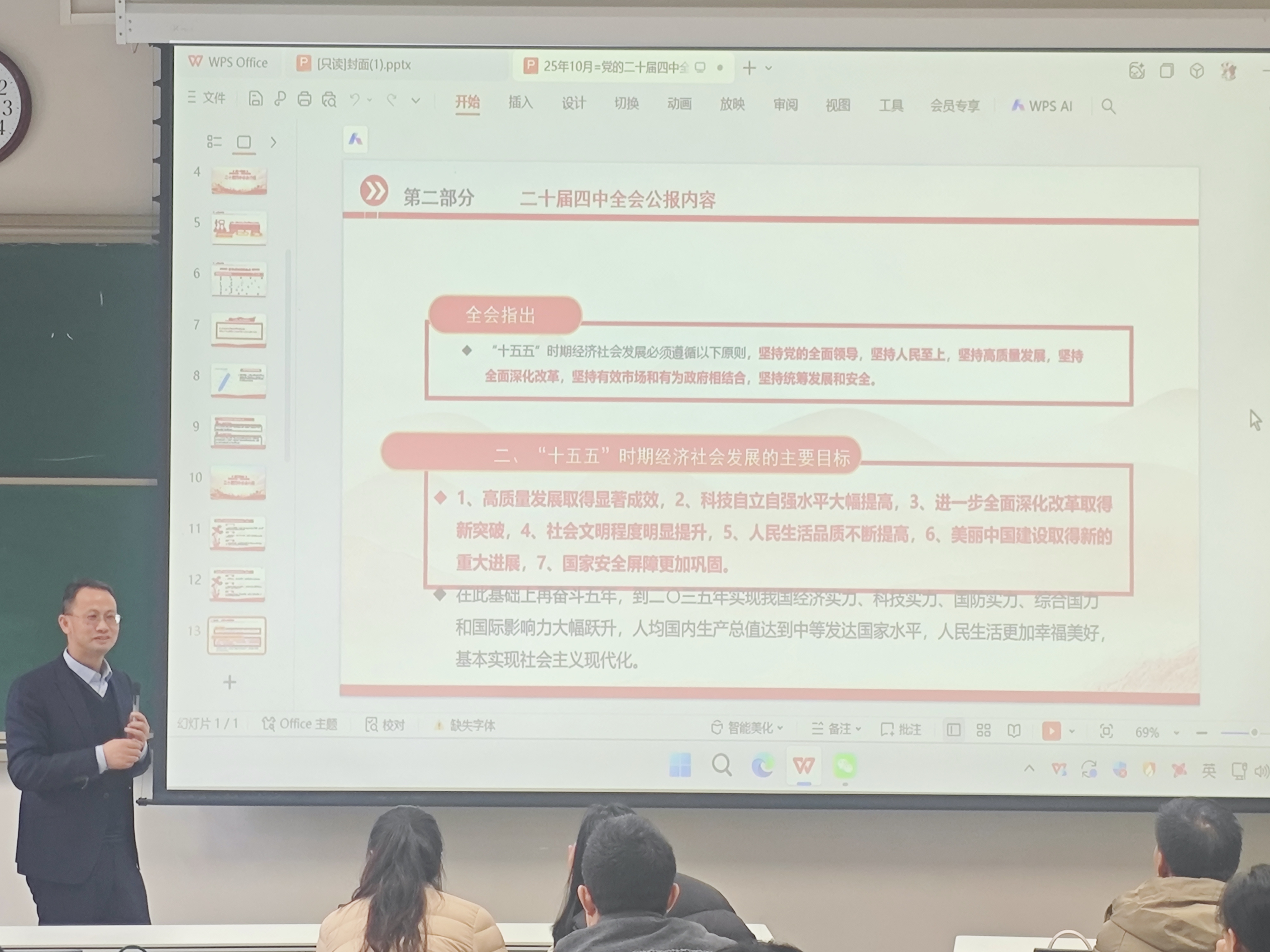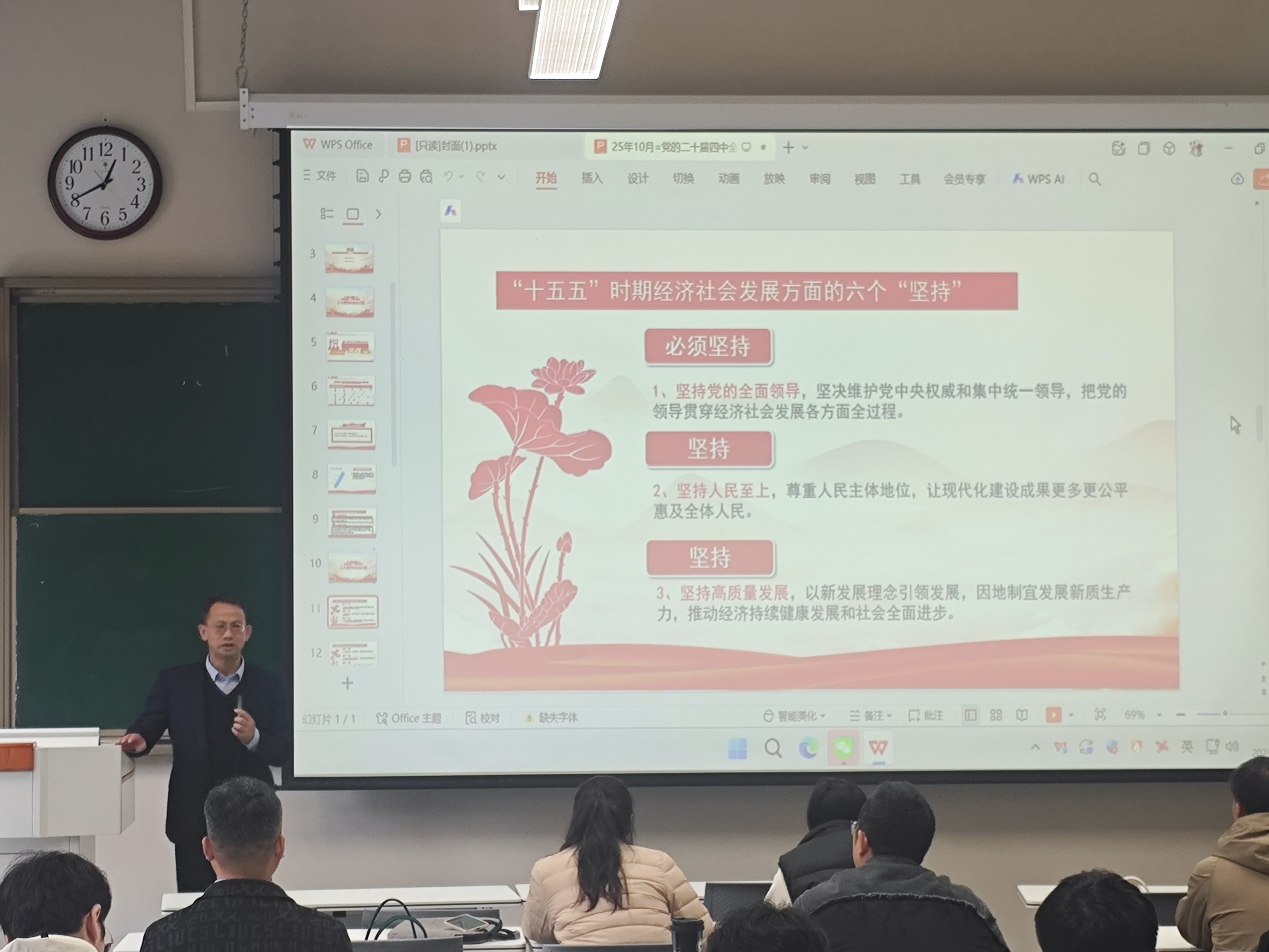 10月29日,马克思主义学院党支部书记曾庆福同志为全院教师和党员作了学习贯彻党的二十届四中全会精神专题报告,重点围绕全会确立的“六个坚持”重要原则和“十五五”规划建议进行了系统讲解,并就进一步贯彻落实全会精神提出了明确要求。