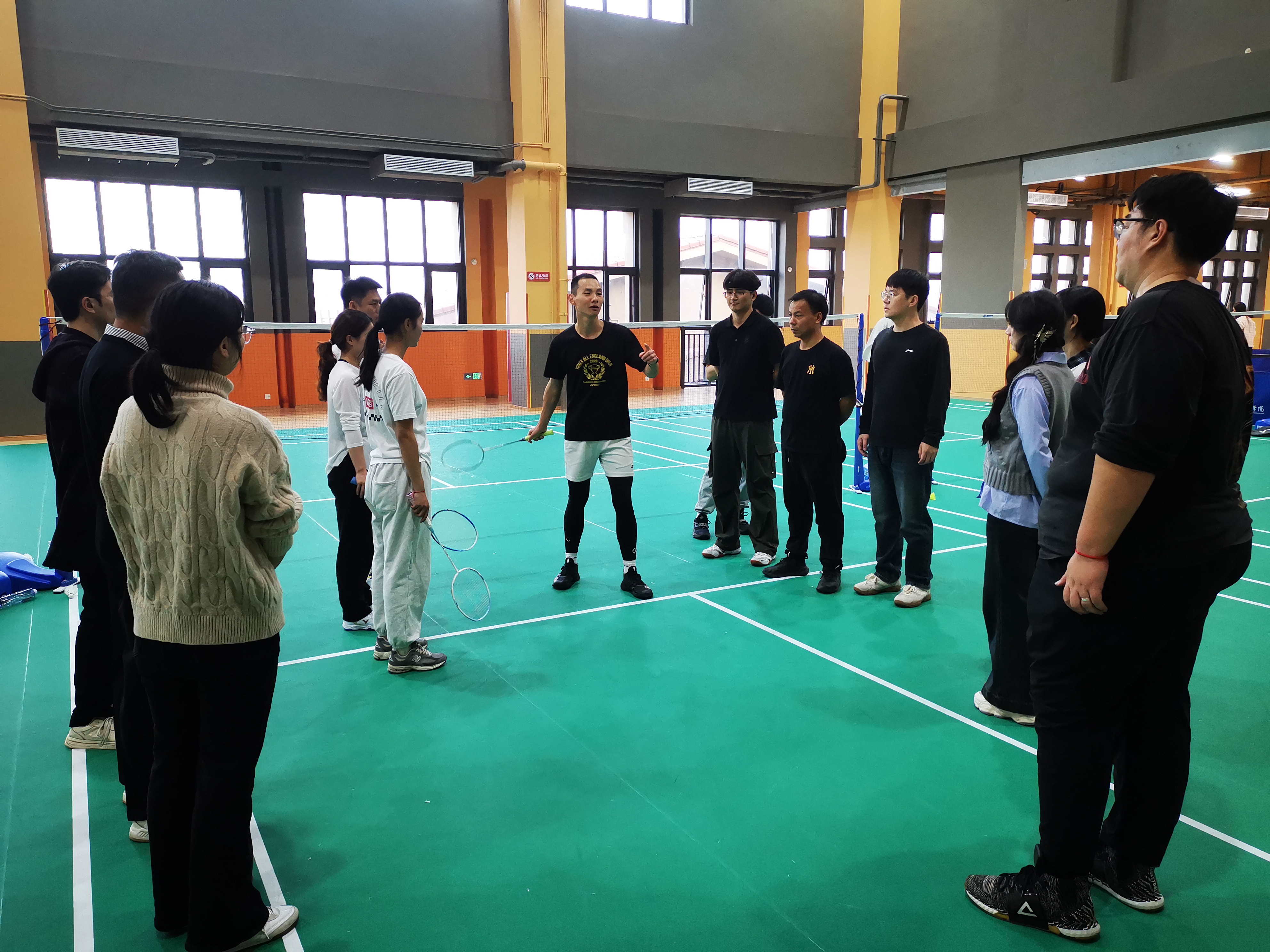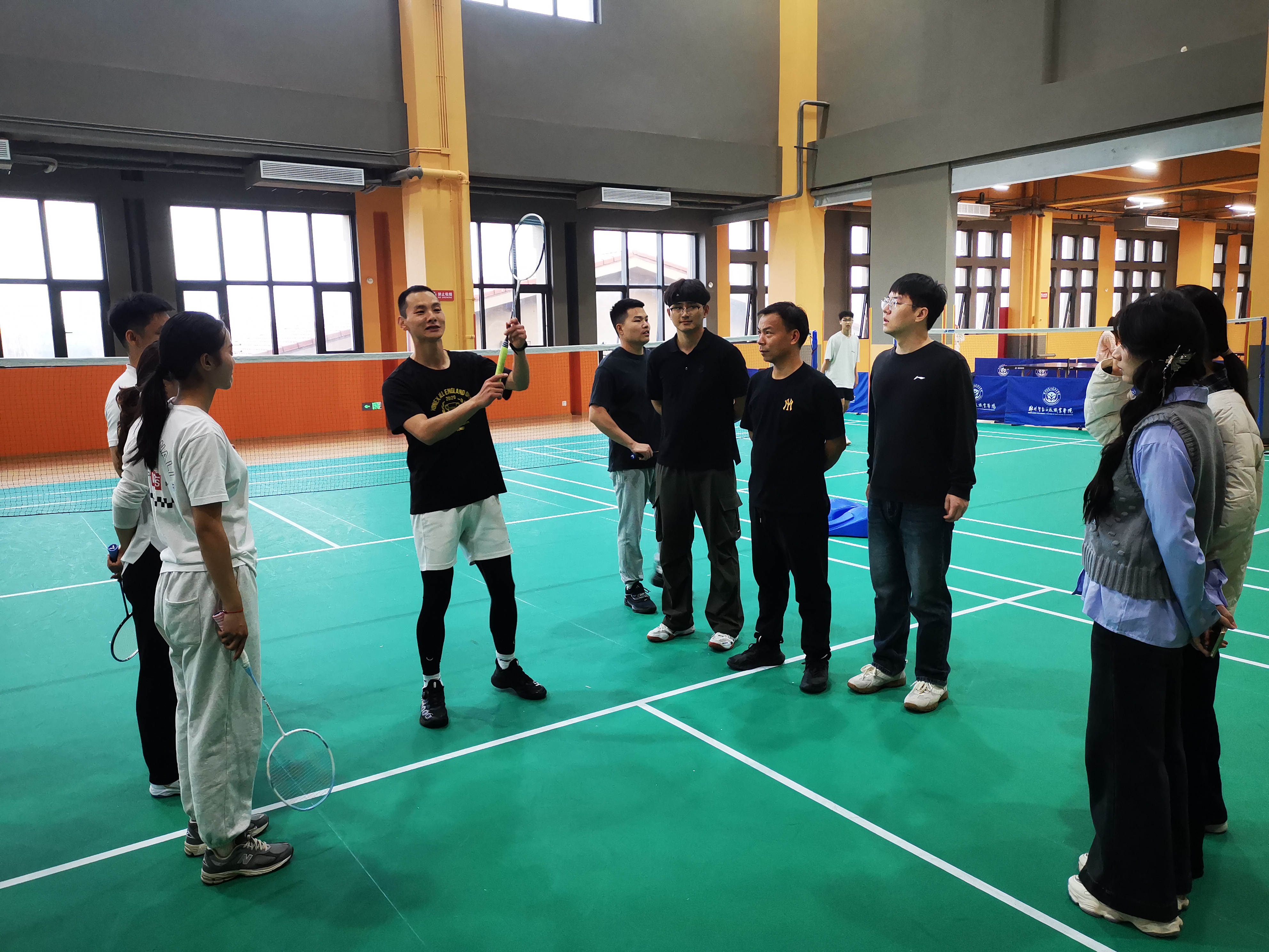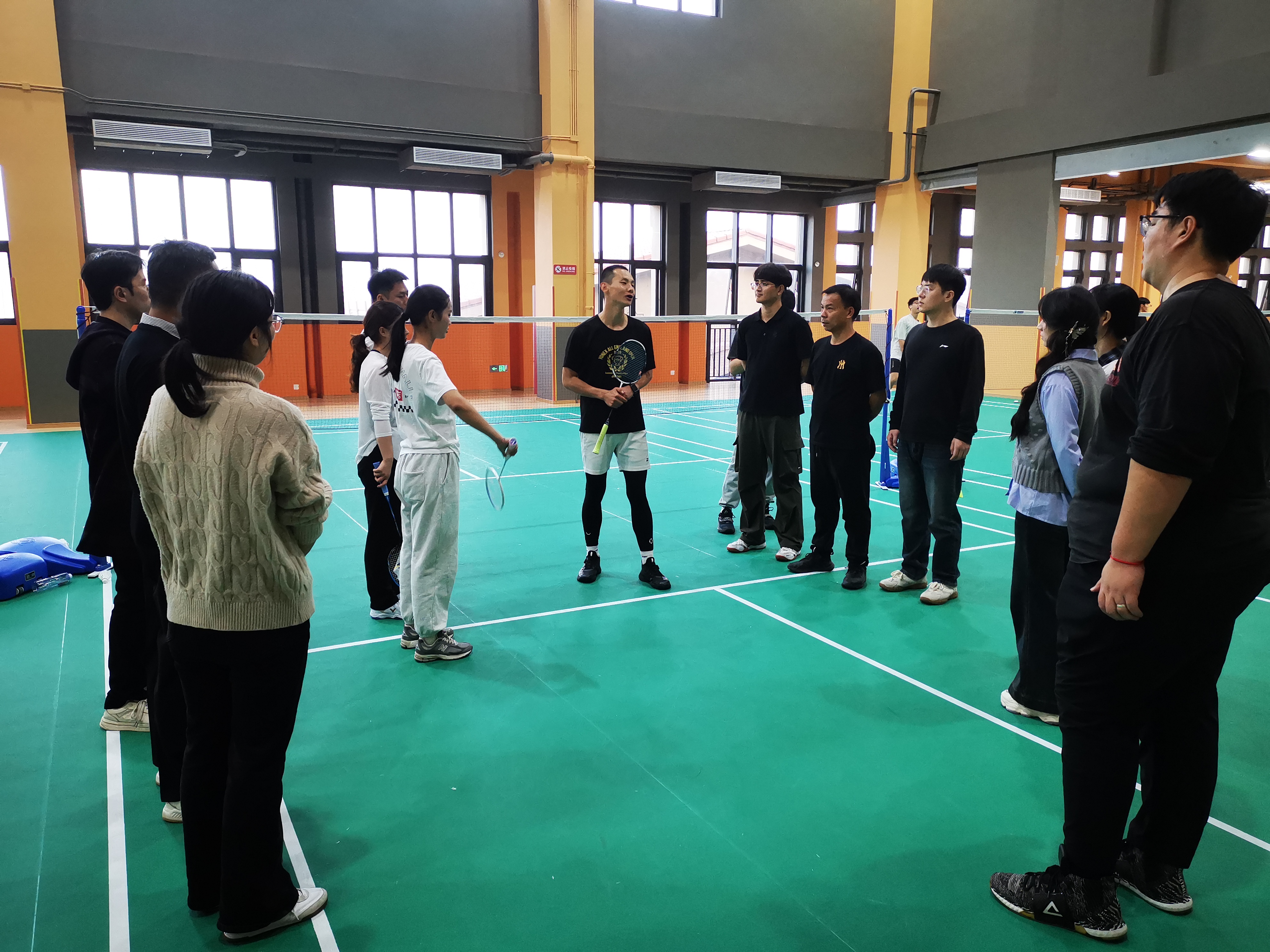 最后让老师之间进行羽毛球对练,学习和掌握羽毛球动作要领和技术。