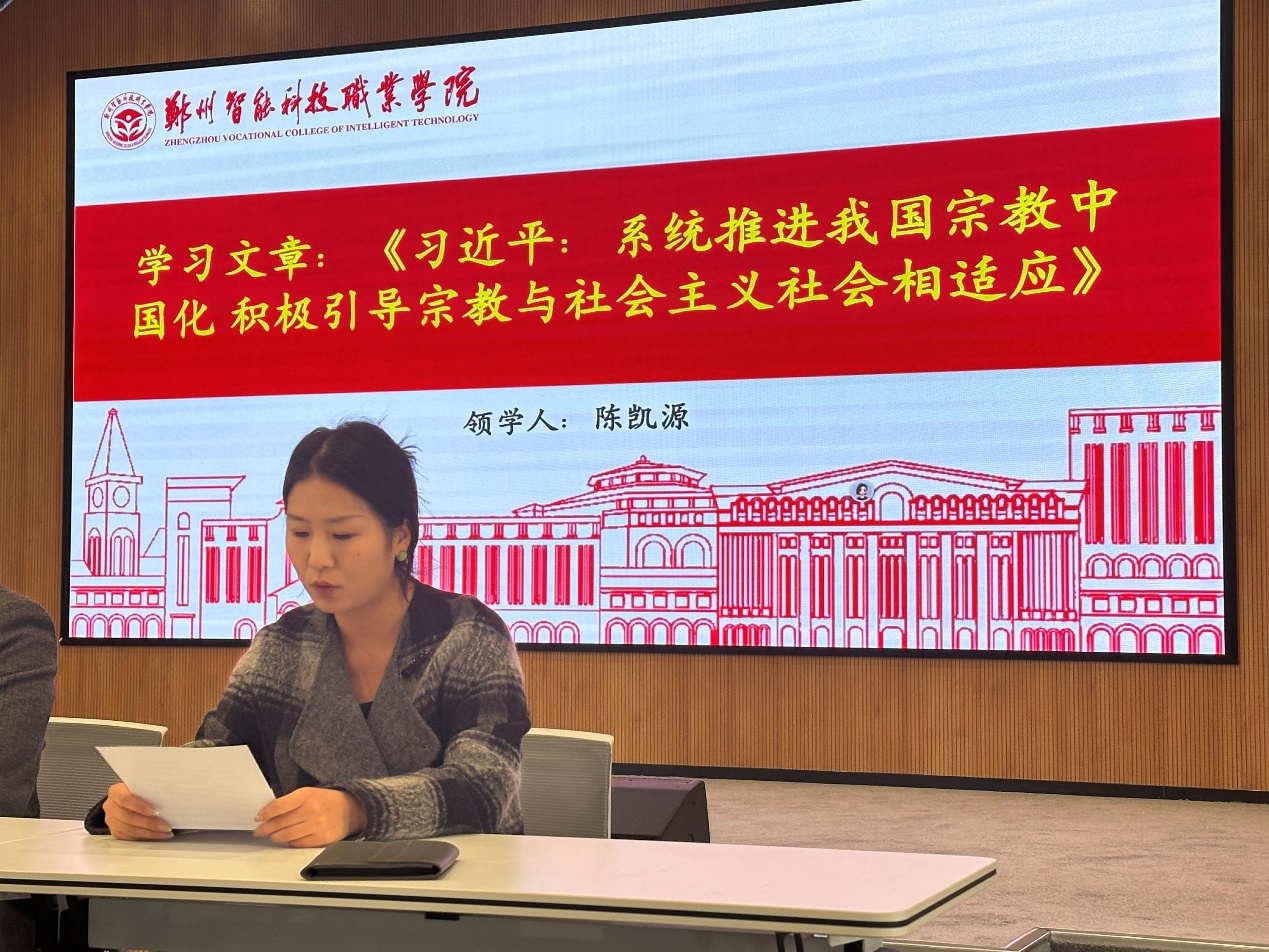 随后,陈凯源领学《习近平:系统推进我国宗教中国化 积极引导宗教与社会主义社会相适应》,结合高校工作实际与人工智能领域特色,深入分析了当前校园意识形态工作面临的新形势、新挑战,并强调党员教师要立足教学科研岗位,将意识形态教育融入课程思政、学生管理等各环节,以正能量引领青年学生树立正确的国家观、民族观、宗教观、文化观。