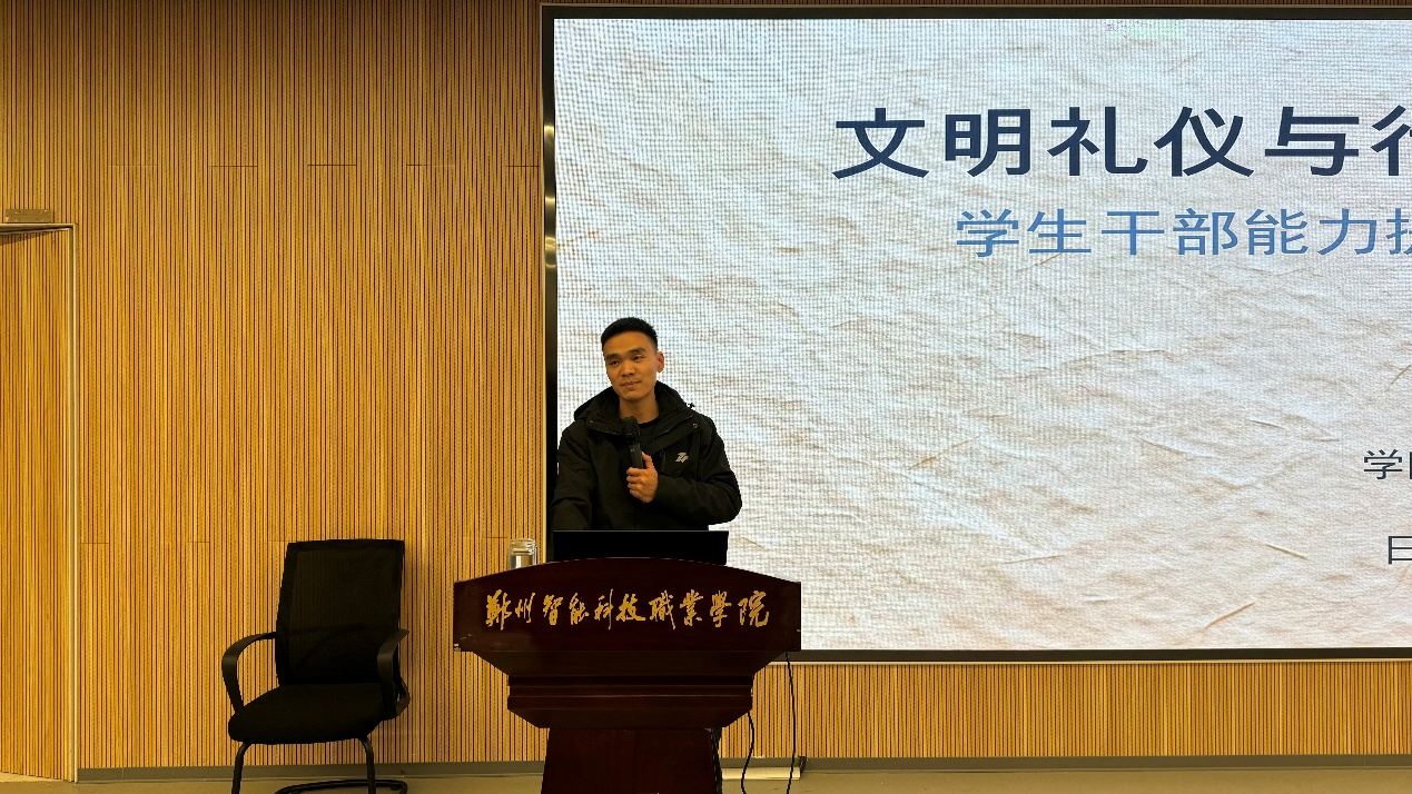 杨万里老师以“文明礼仪与行为规范”为主题,从日常交往、公务活动等方面入手,讲解了文明礼仪的基本常识与行为规范,帮助学员们提升个人修养,树立良好的学生干部形象。