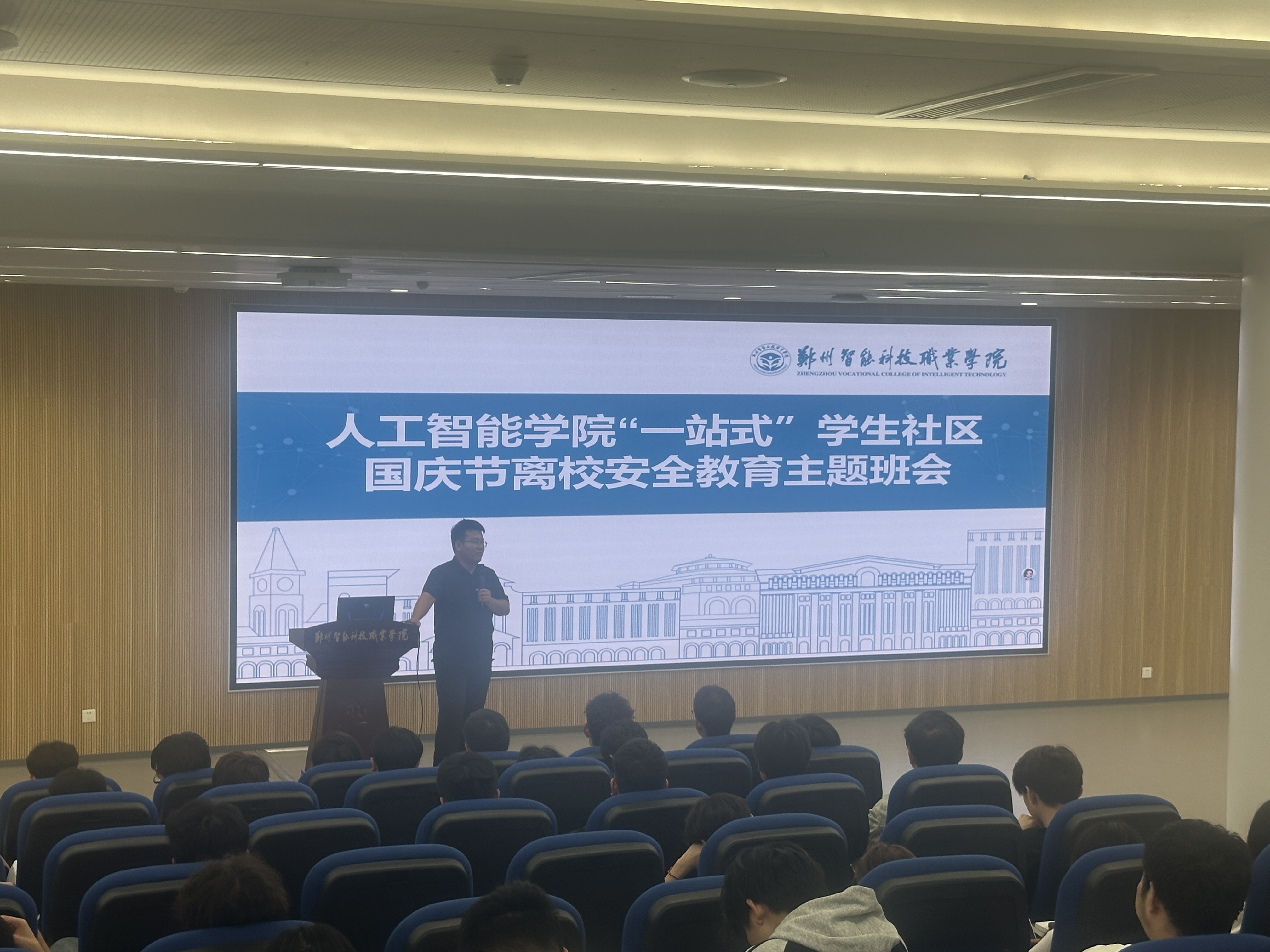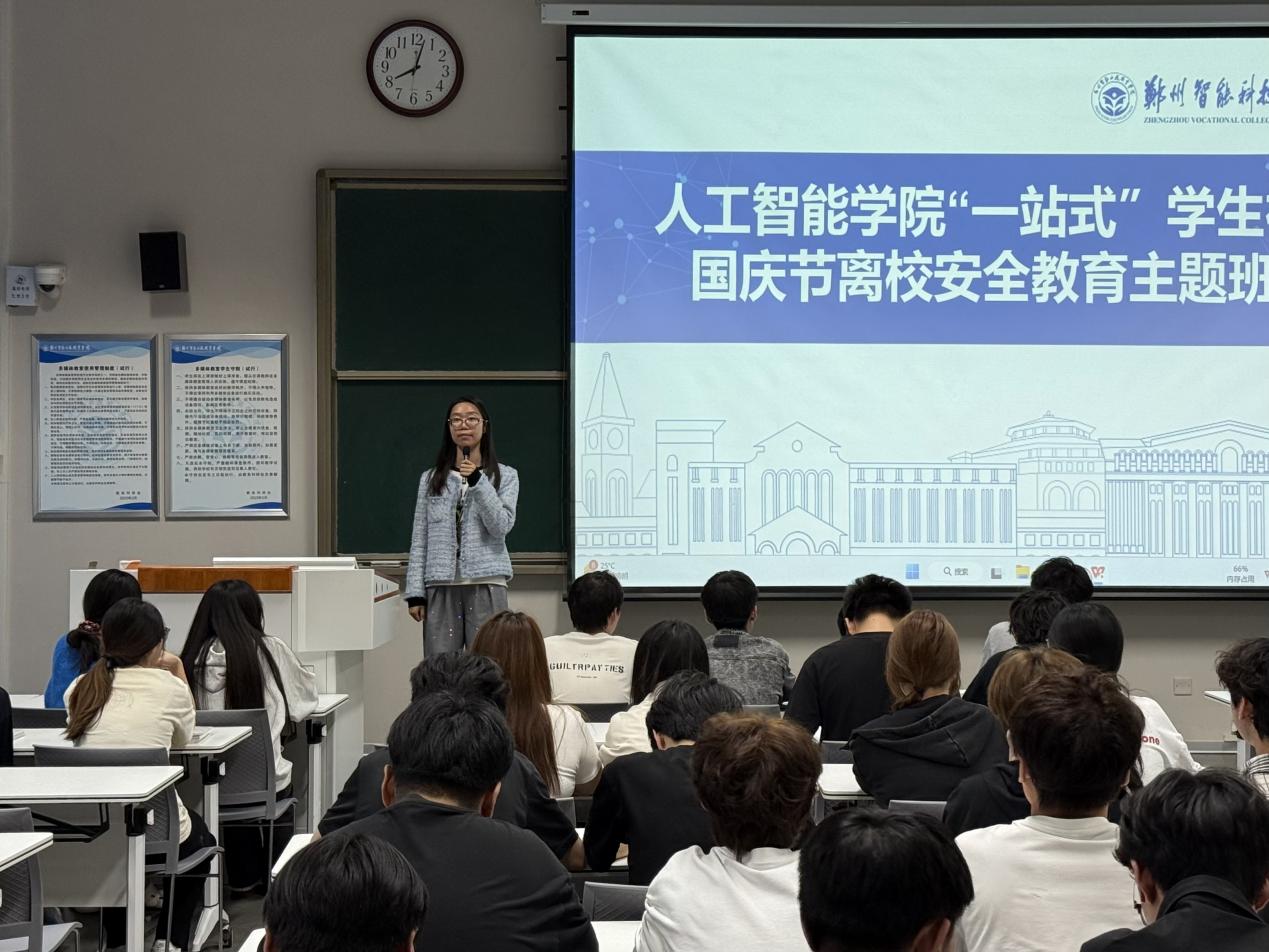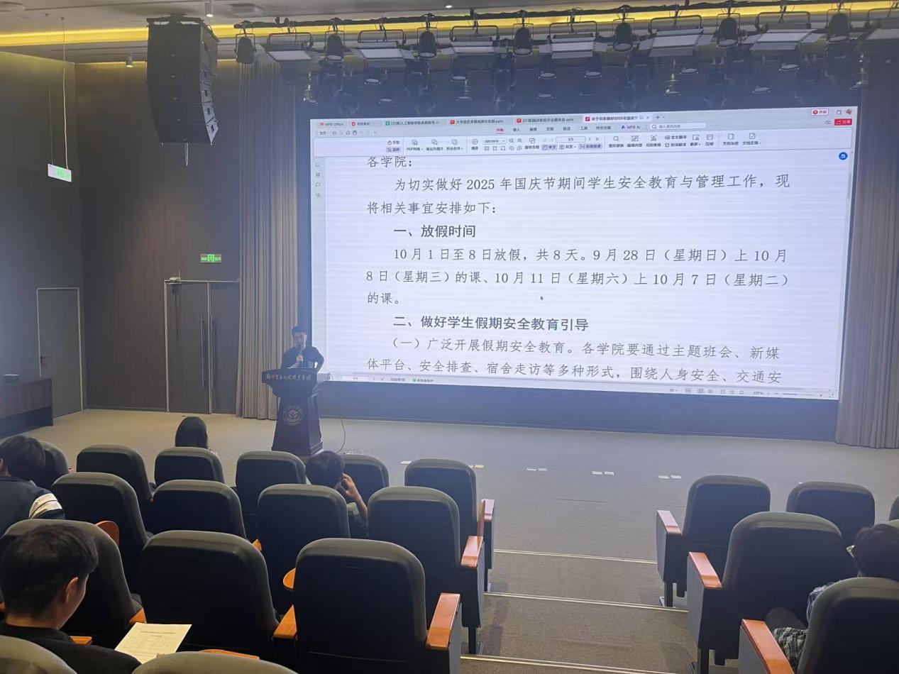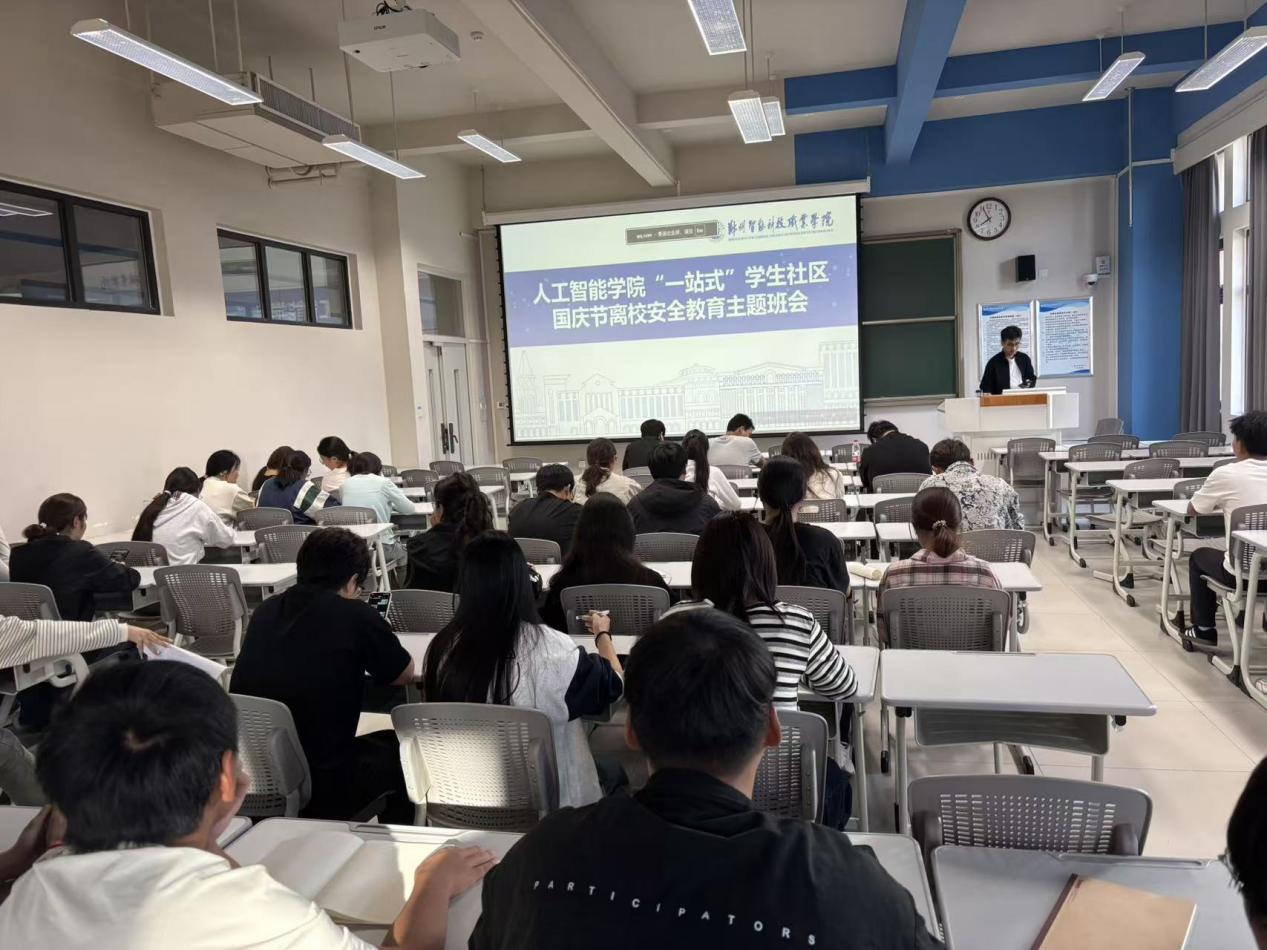 发布日期:2025-11-27 访问次数:为切实筑牢国庆假期安全防线,保障学生人身财产安全,近日,人工智能学院“一站式”学生社区组织开展国庆安全教育主题班会,学院全体辅导员、在校学生全员参会。