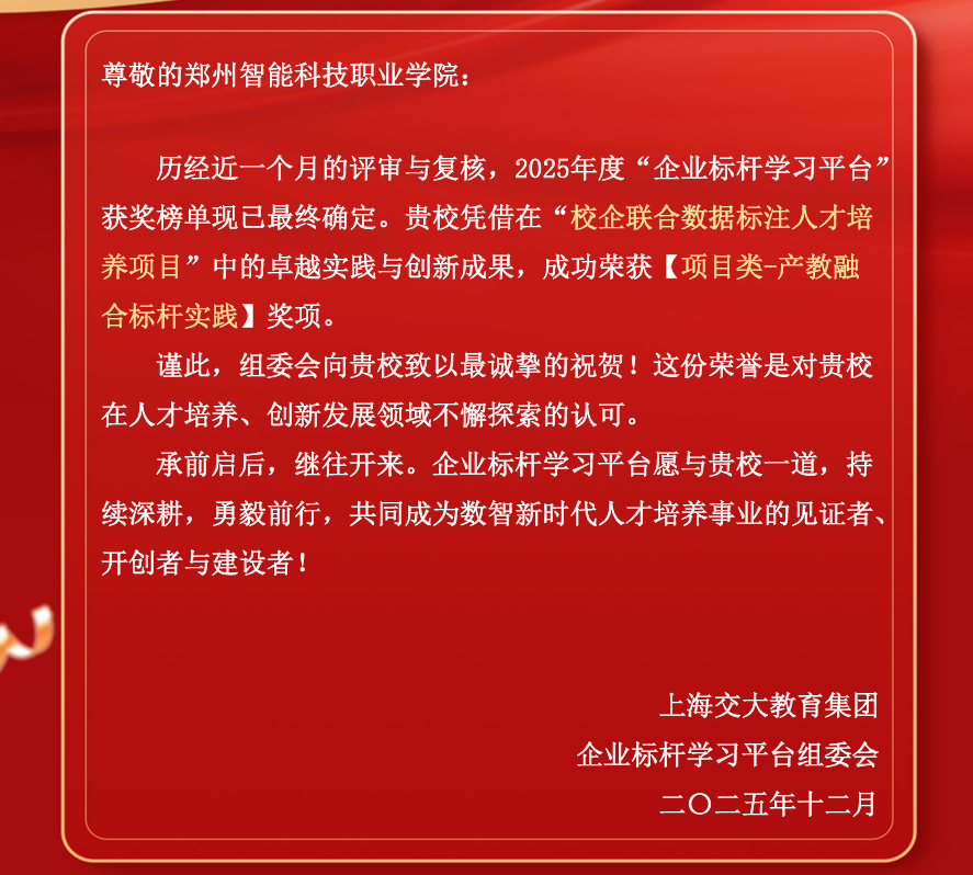 近日,2025企业标杆学习平台(原中国最佳企业大学排行榜)正式揭晓评选结果。我校人工智能学院申报的“校企联合数据标注人才培养项目”,在人才培养模式创新与产教融合实践方面成效显著,成功荣获【项目类——产教融合标杆实践】奖项。
