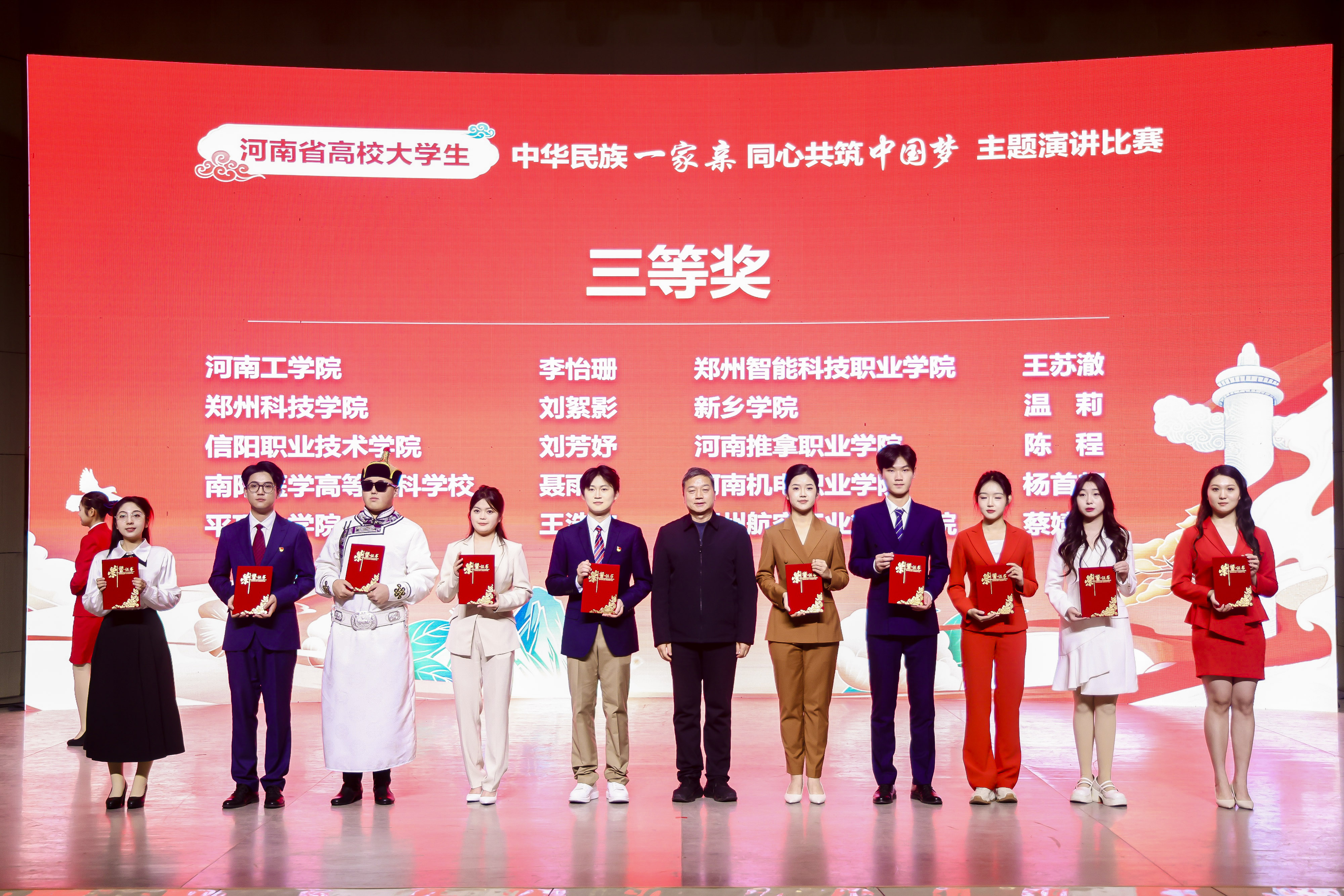 12月4日,河南省高校大学生“中华民族一家亲 同心共筑中国梦”主题演讲比赛在河南师范大学圆满落幕。本次演讲比赛由省委教育工委、省教育厅主办,旨在加强民族团结宣传教育,展现新时代大学生的精神风貌。全省共有151所高校参与,45所高校入围决赛,经过激烈角逐,我校参赛选手传媒学院2024级的王苏澈同学荣获三等奖。