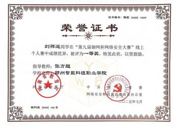 个人简介:刘祥运,男,共青团员,郑州智能科技职业学院人工智能学院2023级计算机网络技术(网络安全)1班班长,同时担任校内“极客网络运维”社团社长,在校期间成绩优异,曾荣获:河南省三好学生,第九届华为ICT大赛-网络实践赛省赛三等奖,华为网络安全高级工程师(HCIP)认证,第十四届新华三杯全国大学生数字技术大赛省赛二等奖,第三届锐捷全国大学生信息技术大赛省赛二等奖,校内学习标兵、三好学生,第九届御网杯网络安全大赛线上个人赛省赛一等奖、线下团队赛二等奖,第十六届蓝桥杯全国软件和信息技术专业人才大赛全国总决赛网络安全大学组二等奖、河南省省赛网络安全大学组一等奖,第二十二届全国大学生信息安全与对抗技术竞赛夺旗挑战赛国赛二等奖、无限擂台赛国赛三等奖,一带一路暨金砖国家技能发展与技术创新大赛--企业系统安全赛项省级选拔赛河南省第一名,申请计算机软件著作权,第四届锐捷全国大学生信息技术大赛省赛二等奖。