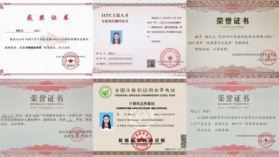个人简介:杨忆凡,女,共青团员,郑州智能科技职业学院智能制造学院2024级物联网应用技术2班。在大一学年,参加河南省大学生英语竞赛并获得优秀奖;获得“优秀青年志愿者”荣誉称号;2024-2025学年学业成绩班级第一,综测排名班级第一,并在课余时间通过全国计算机应用基础水平考试。