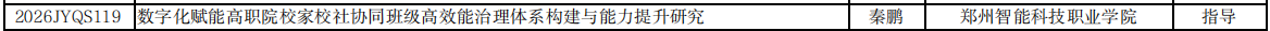 近日,中共河南省委教育工作委员会、河南省教育厅联合印发《关于公布2026年度河南省教育强省专项研究项目立项名单的通知》,我校学生工作课题项目《数字化赋能高职院校家校社协同班级高效能治理体系构建与能力提升研究》成功获批立项。该课题由秦鹏主持,侯迪、杨安易、朱龙博、李森参与。