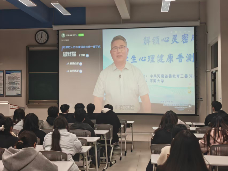 11月14日19点,由省委教育工委、省教育厅主办,河南大学承办的“解锁心灵密码大学生心理健康普测完全指南”主题心理健康公开课活动在线上平台正式开讲。我校积极响应,认真组织各学院学生、辅导员及心理老师等集中观看了此次课程。