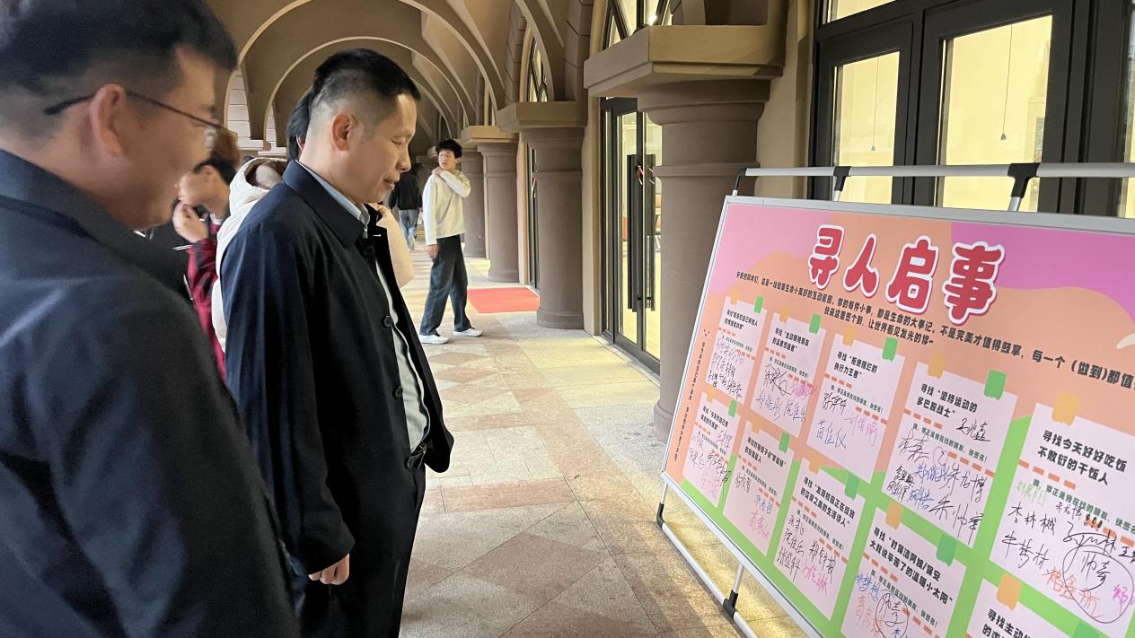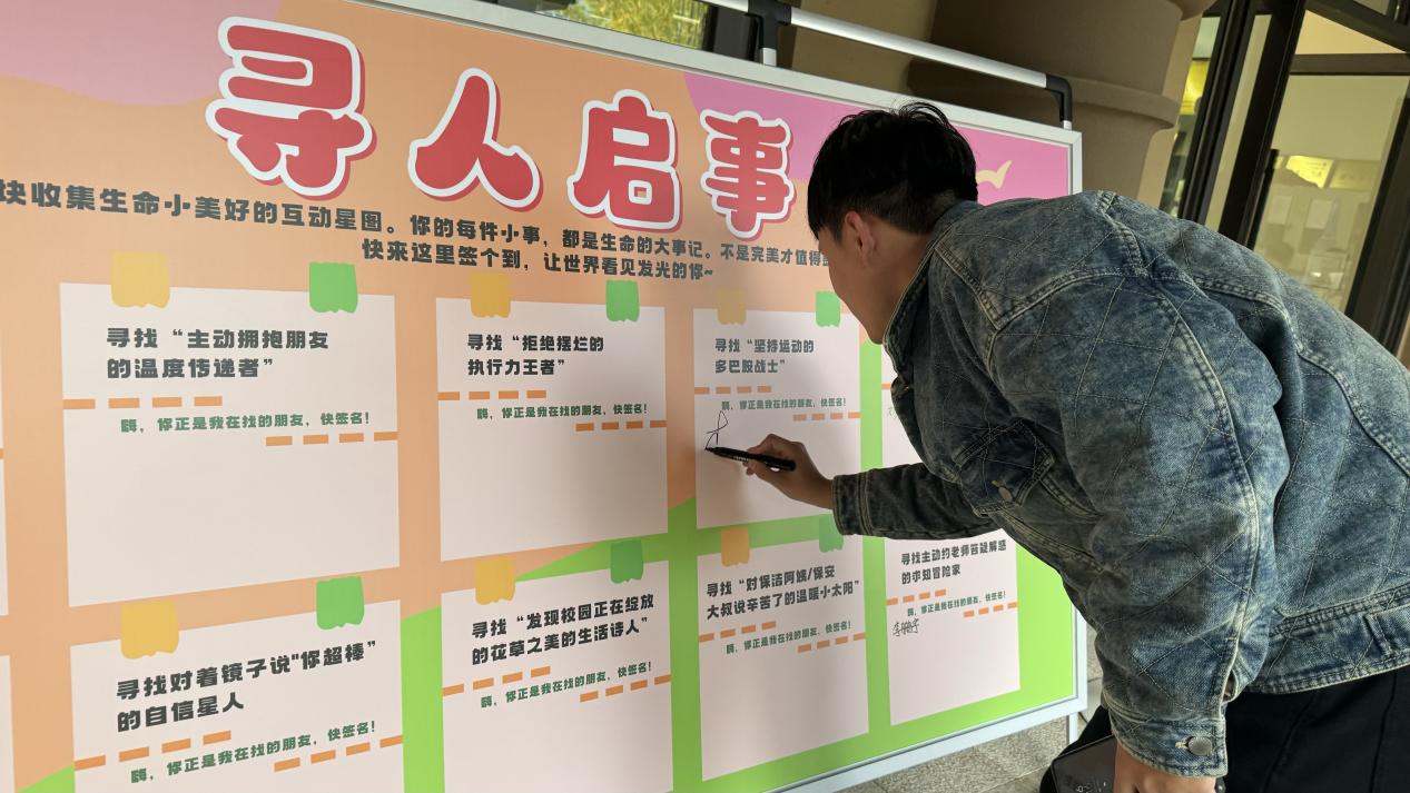 唤醒自我价值认同“寻人启事”书写环节设计巧妙,现场设置“寻找今天好好吃饭不敷衍的干饭人”“寻找拒绝摆烂的执行力王者”“寻找主动拥抱朋友的温度传递者”等多个主题。同学们找到与自身契合的主题后郑重签名,在充满仪式感的落笔中,暂时放下忙碌,聚焦自身存在的意义,重新关注与肯定自我价值。