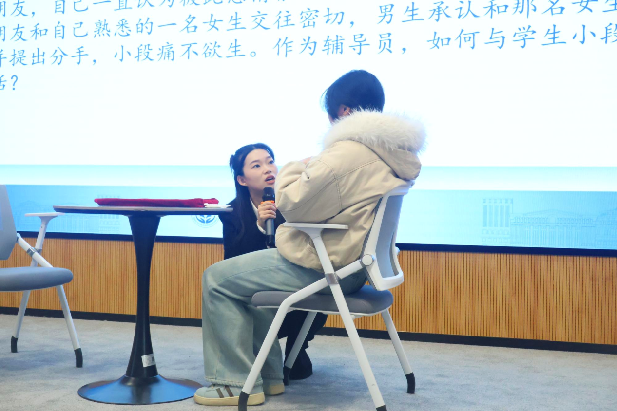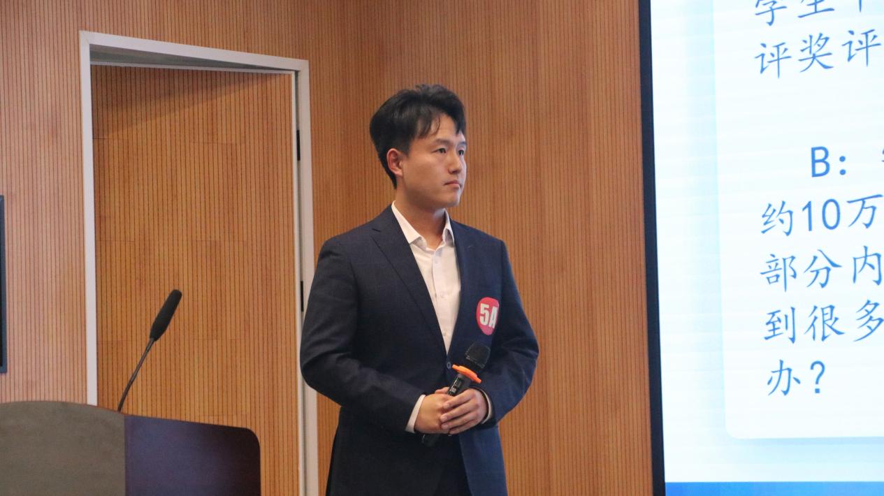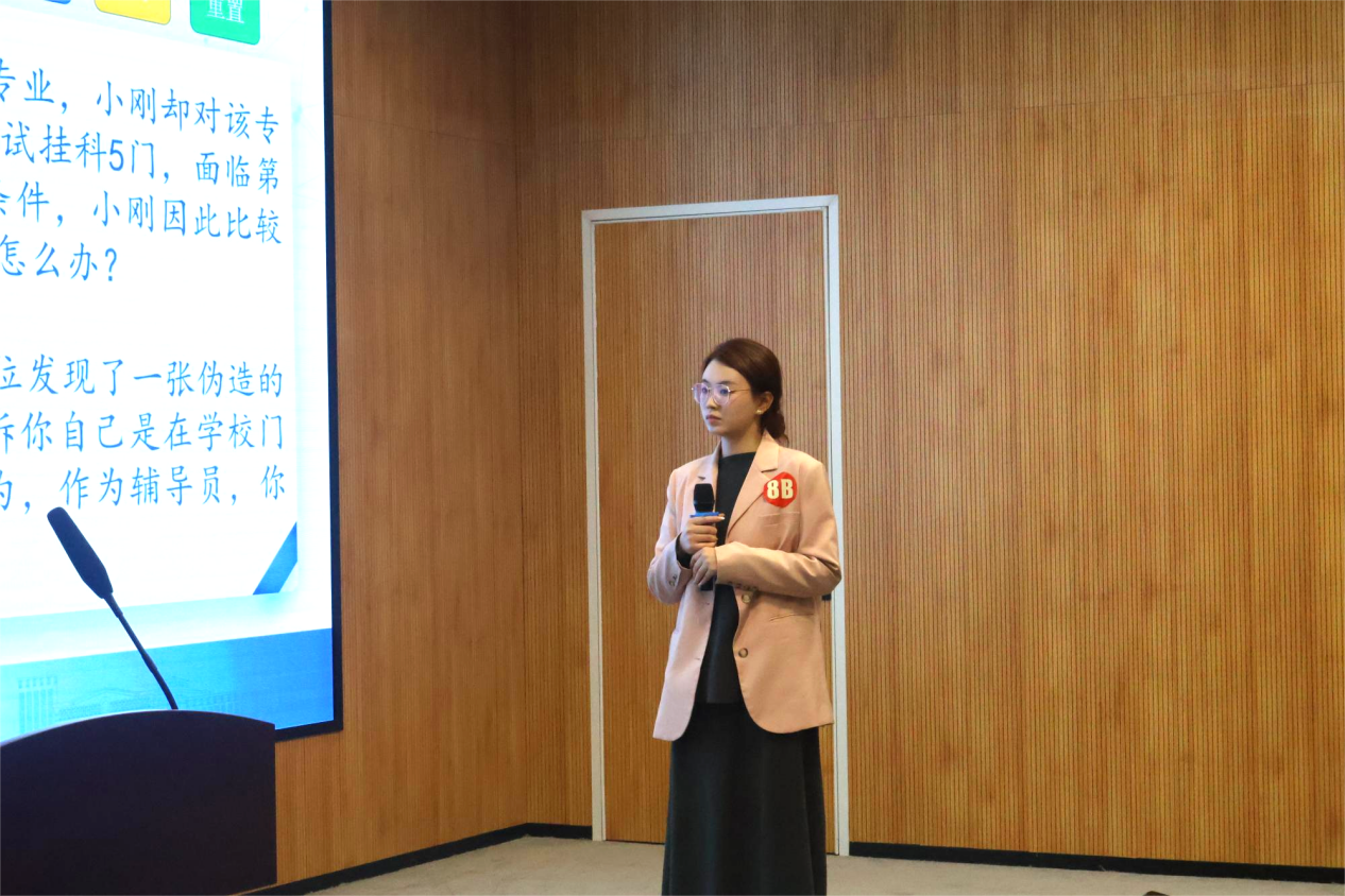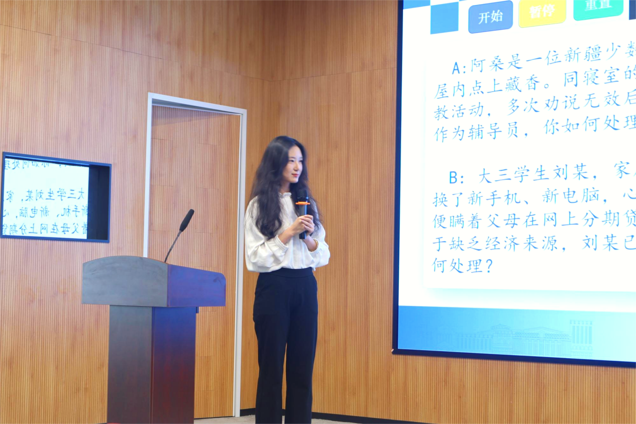 决赛现场气氛热烈而紧张,案例研讨环节主要考察辅导员综合运用理论分析问题、研判问题、解决问题、应急处突等能力。选手在赛前抽取小组、AB角签位,赛前10分钟分别抽取1道案例。比赛以“我提问,你回答”的方式开展,由AB选手围绕案例共同辨析原因、研讨对策、总结规律,并在最后由评委1人进行提问。