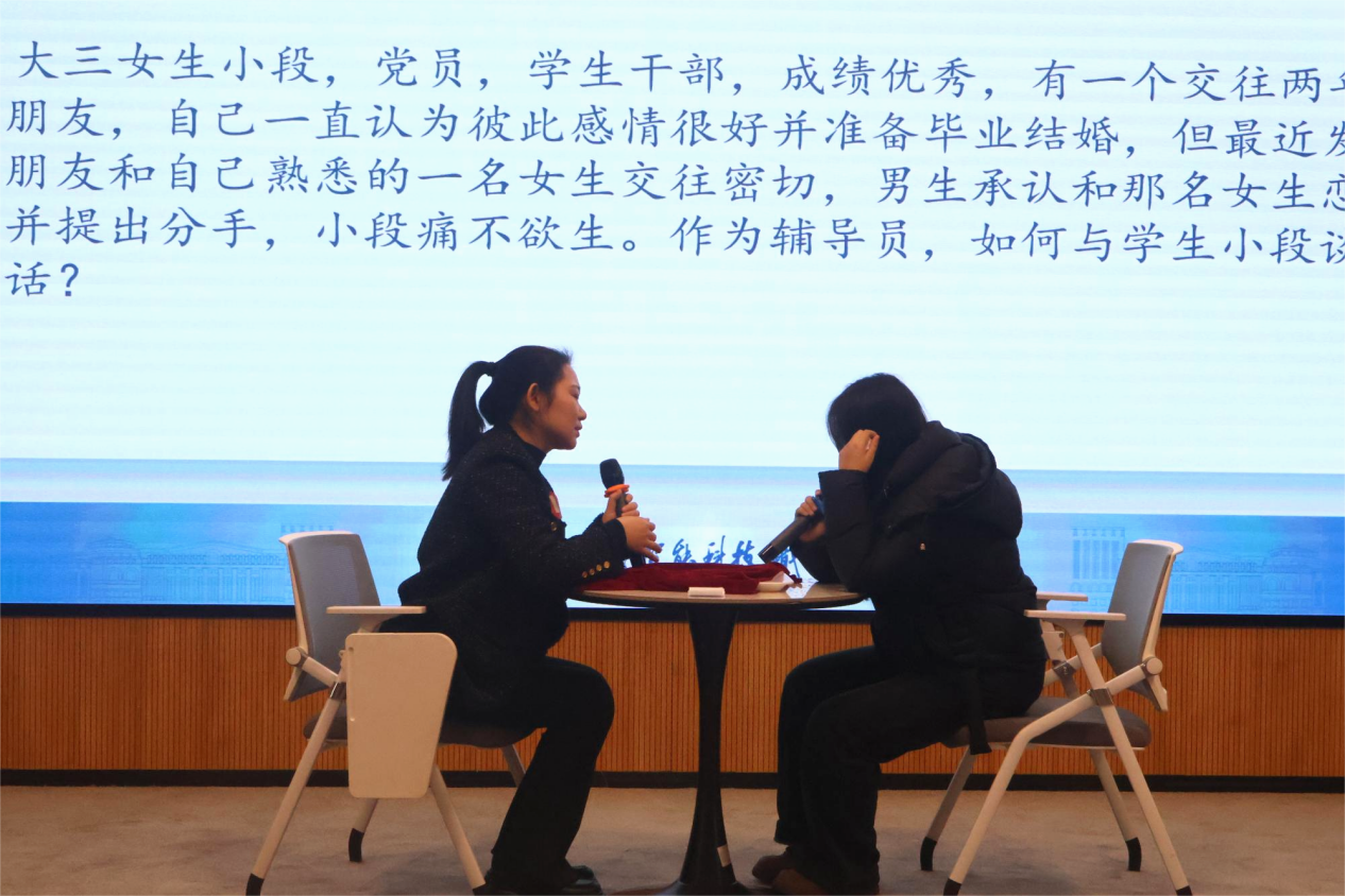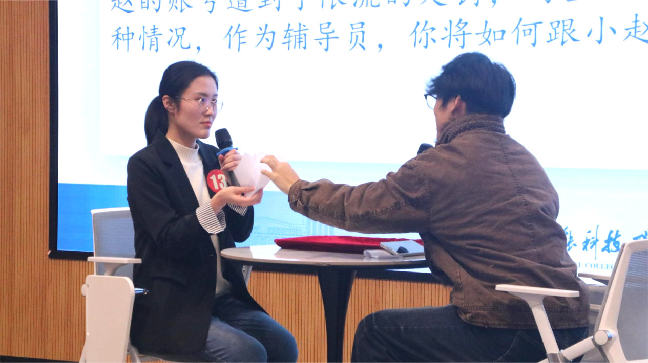 谈心谈话环节主要考察辅导员对学生特征、学生成长成才规律的了解把握程度,对学生的教育引导能力、解决理论困惑和实际问题的能力等。比赛由评委进行现场观摩及打分。参赛选手提前10分钟抽题,按照“人题匹配、同院规避”的原则与提问学生开展谈心谈话。谈话结束后,选手需结合谈话情况进行简短总结,分析存在问题与改进措施,并回答评委提出的1个问题。谈话限10分钟,总结与回答问题各限时2分钟。