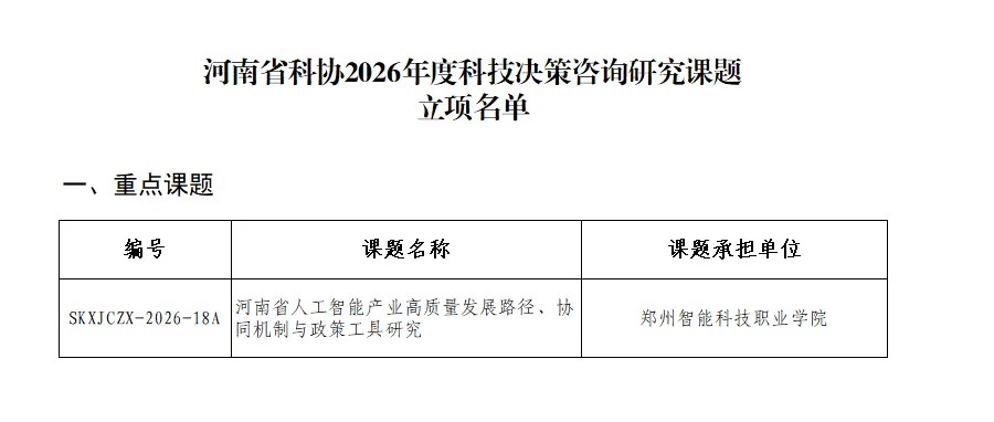 近日,河南省科协公布2026年度科技决策咨询研究课题立项名单,我校特聘教授李晟博士申报的项目《河南省人工智能产业高质量发展路径、协同机制与政策工具研究》,经专家评审、省科协审议和社会公示等程序,成功获批重点课题立项。
