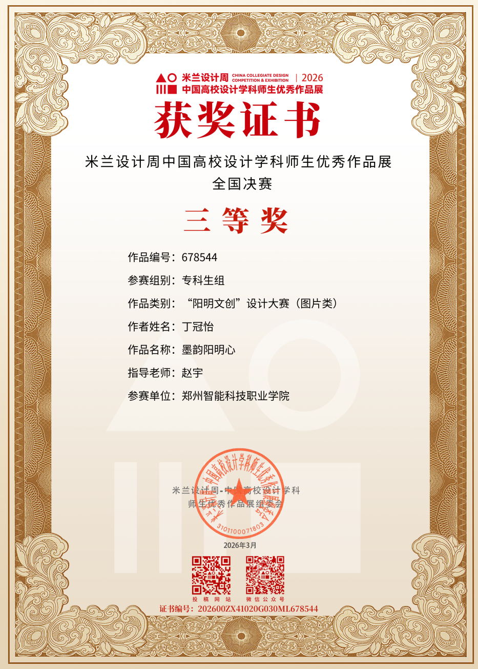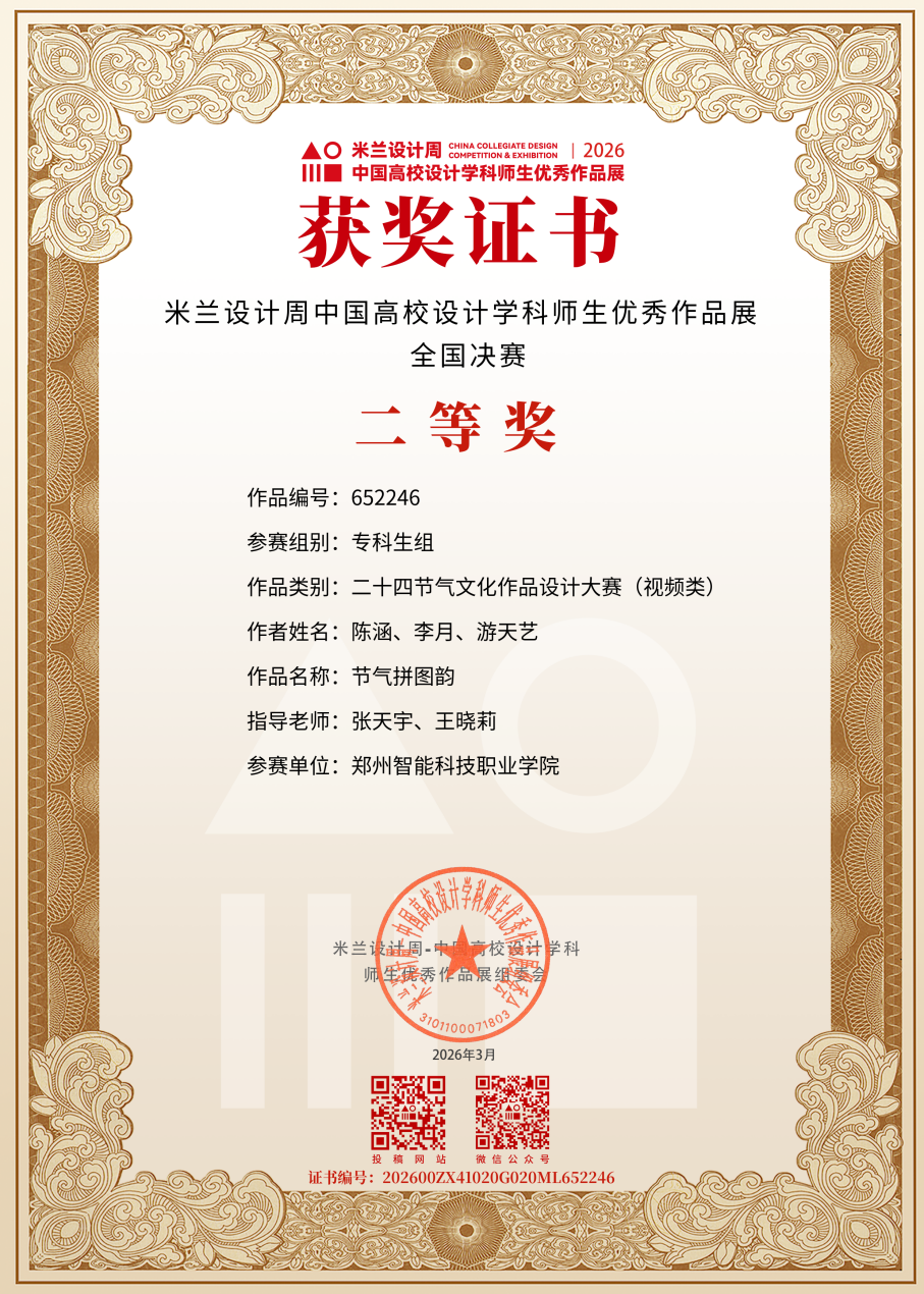 《AI视频创作基础》课程教师张天宇、王晓莉所指导的2024级数字媒体技术4班陈涵、李月、游天艺三位同学,凭借契合赛事主题的创意呈现,荣获二十四节气文化作品设计大赛(视频类)专项赛全国决赛二等奖;同时《图形图像基础》课程教师赵宇所指导的2025级数字媒体技术3班丁冠怡同学以新颖的视觉表达形式,夺得“阳明文创”设计大赛(图片类)专项赛全国决赛三等奖。