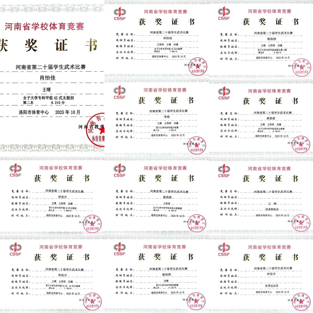 在这场强手如林的激烈角逐中,校武术队队员在教练王晴老师的带领下,斩获多项佳绩。其中,肖怡佳同学在“女子大学专科甲组42式太极剑”和“女子大学专科甲组42式太极拳”取得第二名和第四名;陈浩然同学在“男子大学专科甲组初级棍”和“男子大学专科甲组初级长拳三路”的项目中取得第三名和第四名;郭思甜同学在“女子大学专科甲组其他太极器械”和“女子大学专科甲组其他太极拳”赛项中斩获第三名和第五名;伊浩宇同学在“男子大学专科甲组42式太极剑”和“男子大学专科甲组42式太极拳”双双斩获第七名;李统同学在“男子大学专科甲组少林拳”赛项中取得第八名。通识教育学院体育教师王晴老师和商学院旅游管理专业伊浩宇同学被组委会分别授予“优秀教练员”和“优秀运动员”称号。参赛学生敢打、敢拼的精神风貌和拼搏精神,得到现场观众和评委的一致好评。