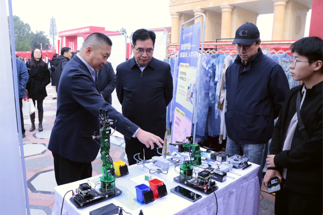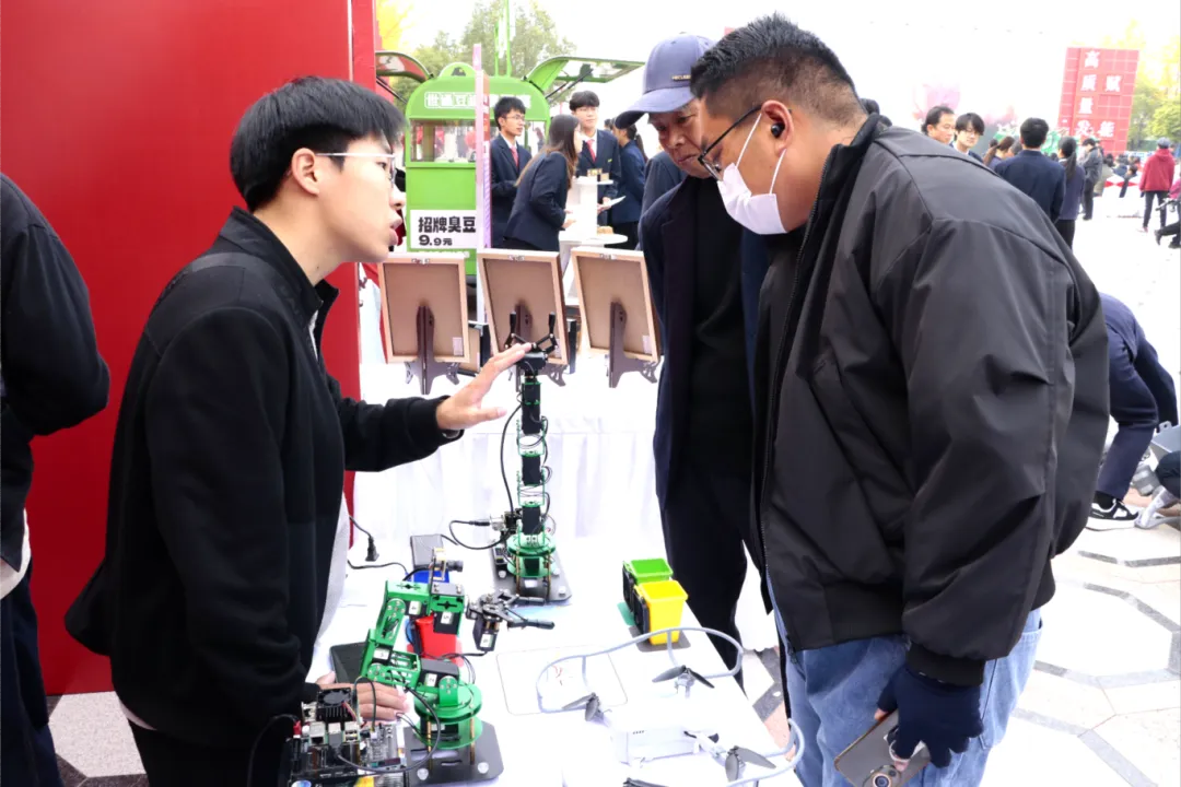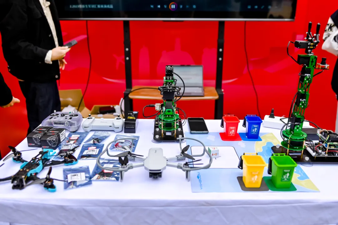 展台上,我校无人机实物与动态演示吸引了众多目光,展现了飞行器技术的应用潜力;六轴机器人流畅完成分拣任务,精准的动作体现了自动化与智能控制的魅力;智能循迹小车与避障机器人则生动演示了传感器技术、自动控制原理在实际场景中的灵活运用。这些作品不仅是我校注重培养学生创新精神和实践能力的直接体现,也获得了参观者的广泛关注与好评。