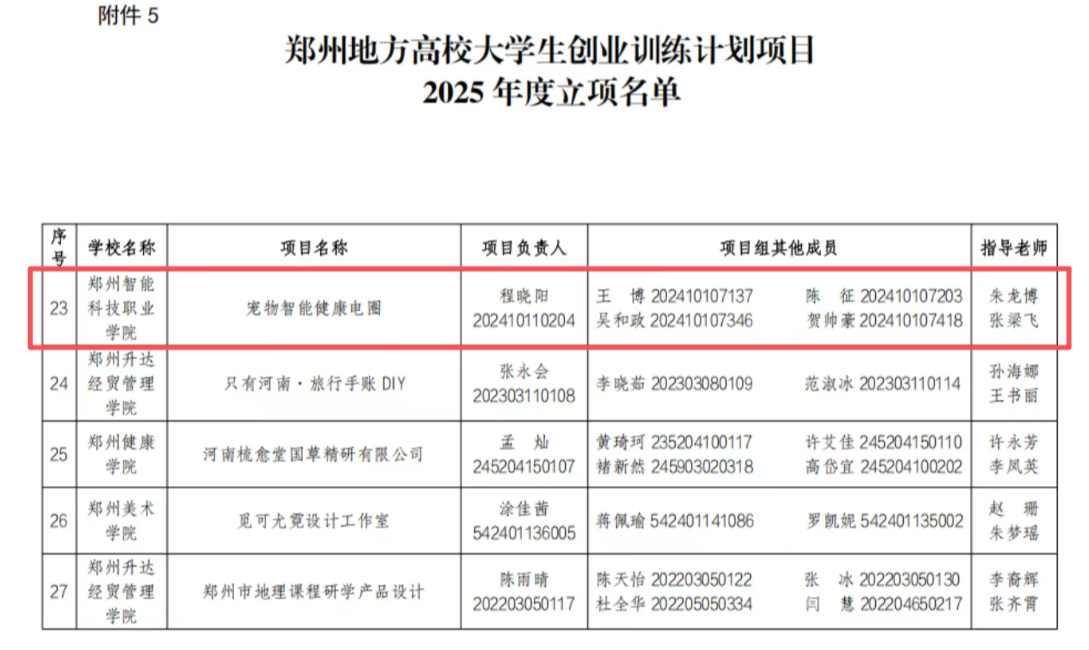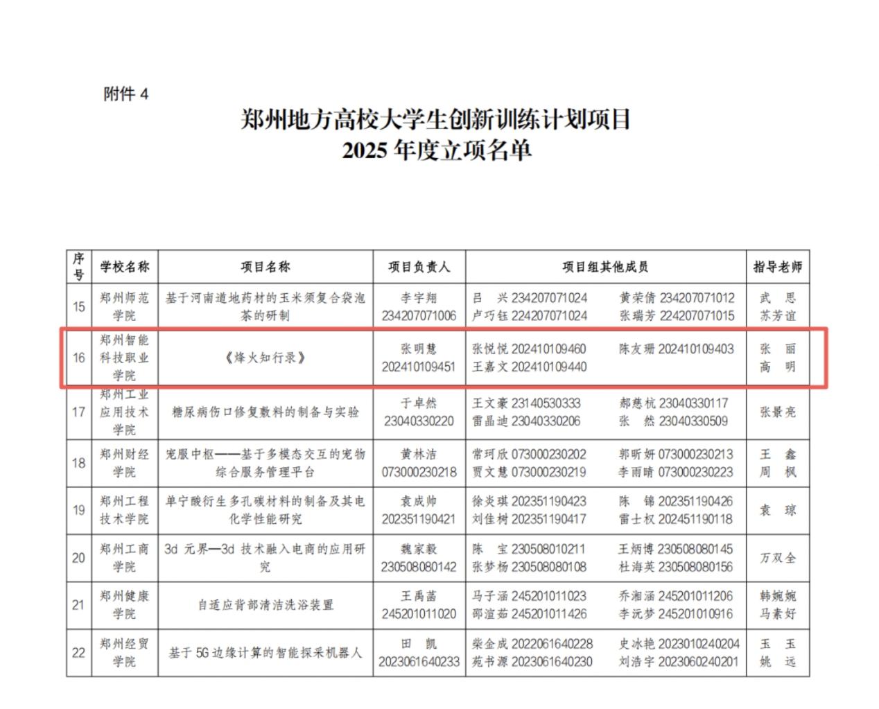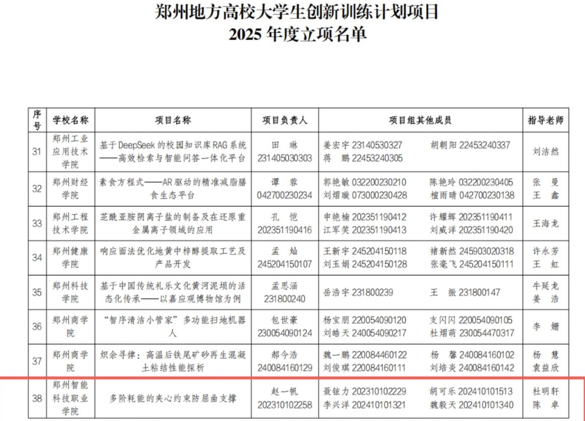 近日,2025年度郑州地方高校大学生创新、创业训练计划项目立项结果公布,我院学子凭借扎实的专业基础与突出的创新能力斩获佳绩,共3个项目成功立项,其中创新训练计划项目2项、创业训练计划项目1项。