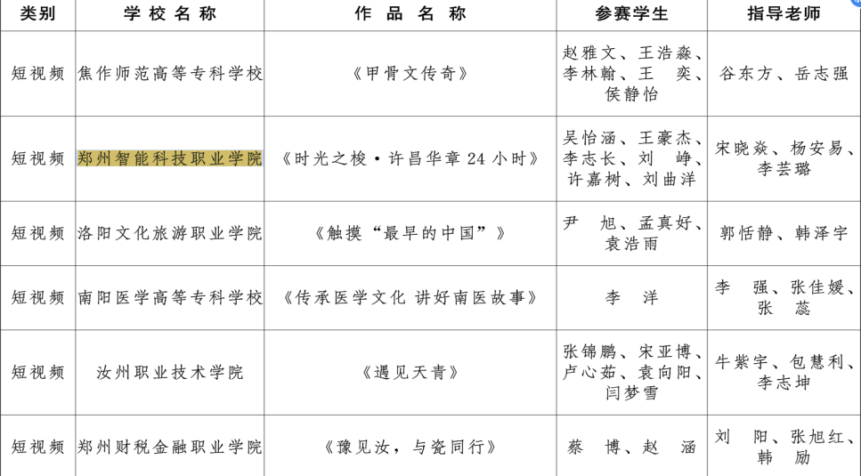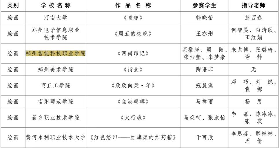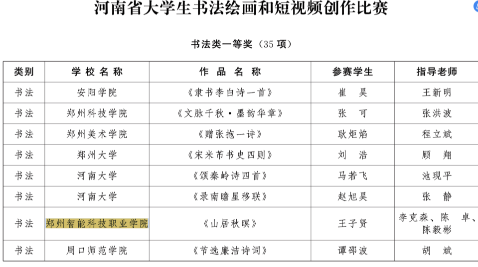 近日,2025年河南省第二十届大学生科技文化艺术活动获奖名单正式公布,我校学子在书法、绘画、短视频类别中表现亮眼,斩获书法类一等奖1项、绘画类二等奖1项、短视频类三等奖1项,以艺术实力彰显青春风采,为校争得荣誉!