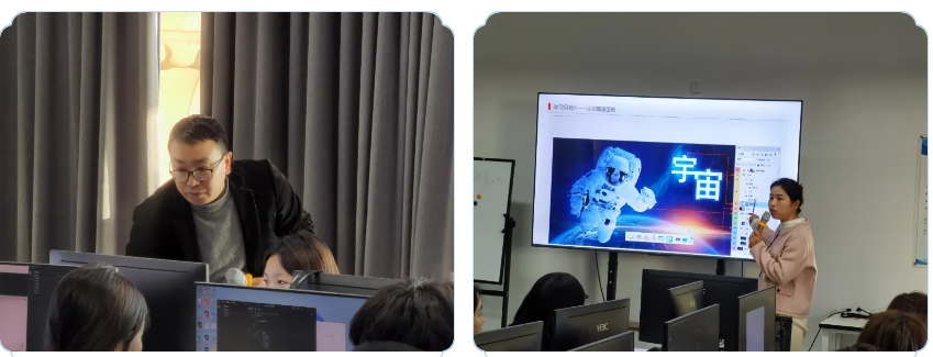 11月19日:数字艺术与智能技术对话。人工智能学院张金祥老师的《网页设计与制作》与传媒学院梁明利老师的《图形图像处理》,率先拉开序幕。前者聚焦代码逻辑与用户体验,后者深耕视觉美学与创意表达,两节课共同呈现了数字时代技术能力与艺术素养培养的并重之道。