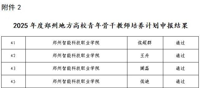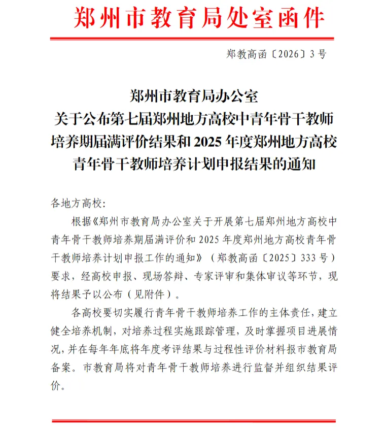 近日,郑州市教育局发布了《关于公布第七届郑州地方高校中青年骨干教师培养期届满评价结果和2025年度郑州地方高校青年骨干教师培养计划申报结果的通知》。我校侯超群、王丹、阚磊、侯迪4位教师凭借扎实的专业能力与良好的综合素质,成功入选2025年度郑州地方高校青年骨干教师培养计划。