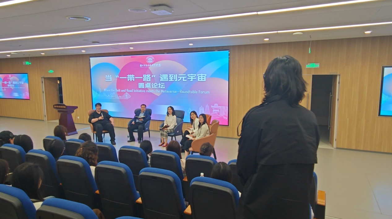 与此同时,多闻厅举行圆桌访谈,人工智能学院副院长王国敬、郑州经贸学院商务英语专业系主任李聪慧、通识教育学院英语教师马静静、刘佳慧围绕跨文化对话、AI国际化展开以“当‘一带一路’遇到元宇宙”为主题的深入讨论,氛围热烈思辨。