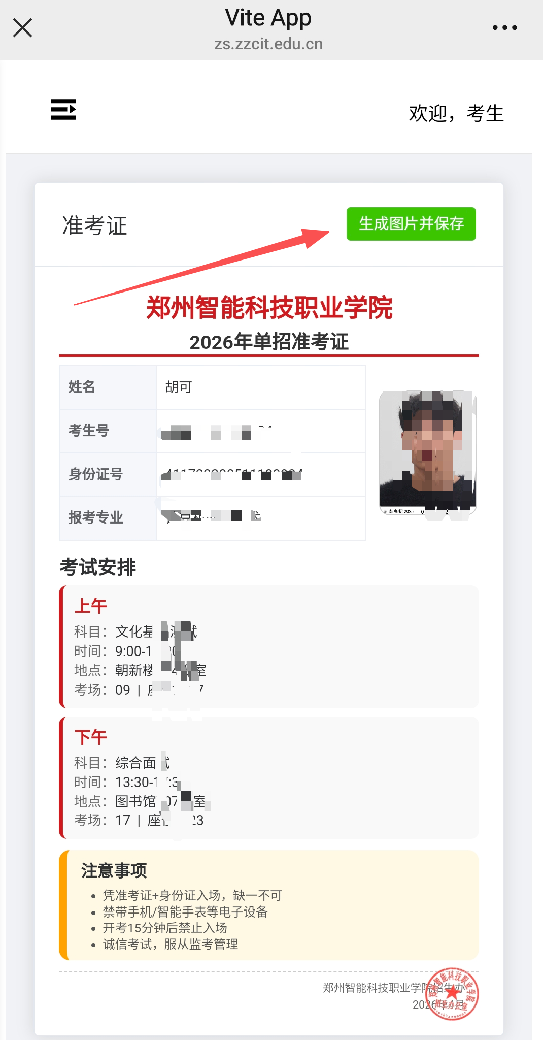 1.请考生在2026年4月25日关注“郑州智能科技职业学院招生办公室”公众号或者登录“郑州智能科技职业学院官网”打印准考证。